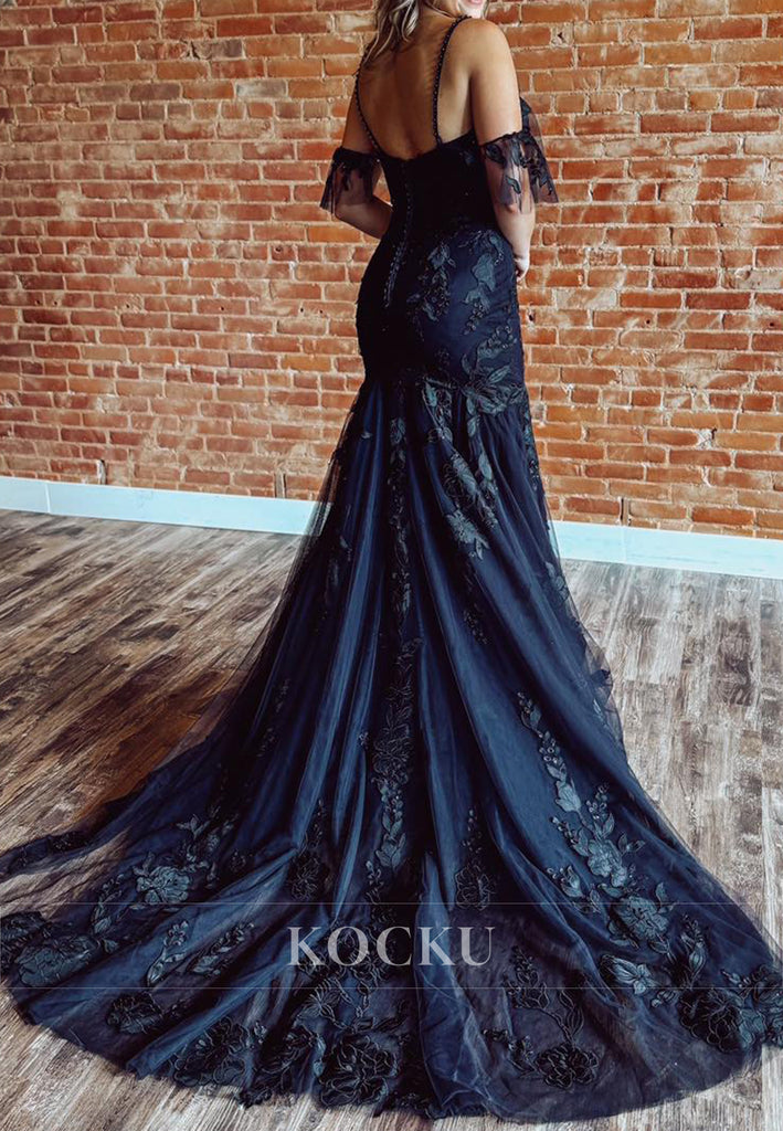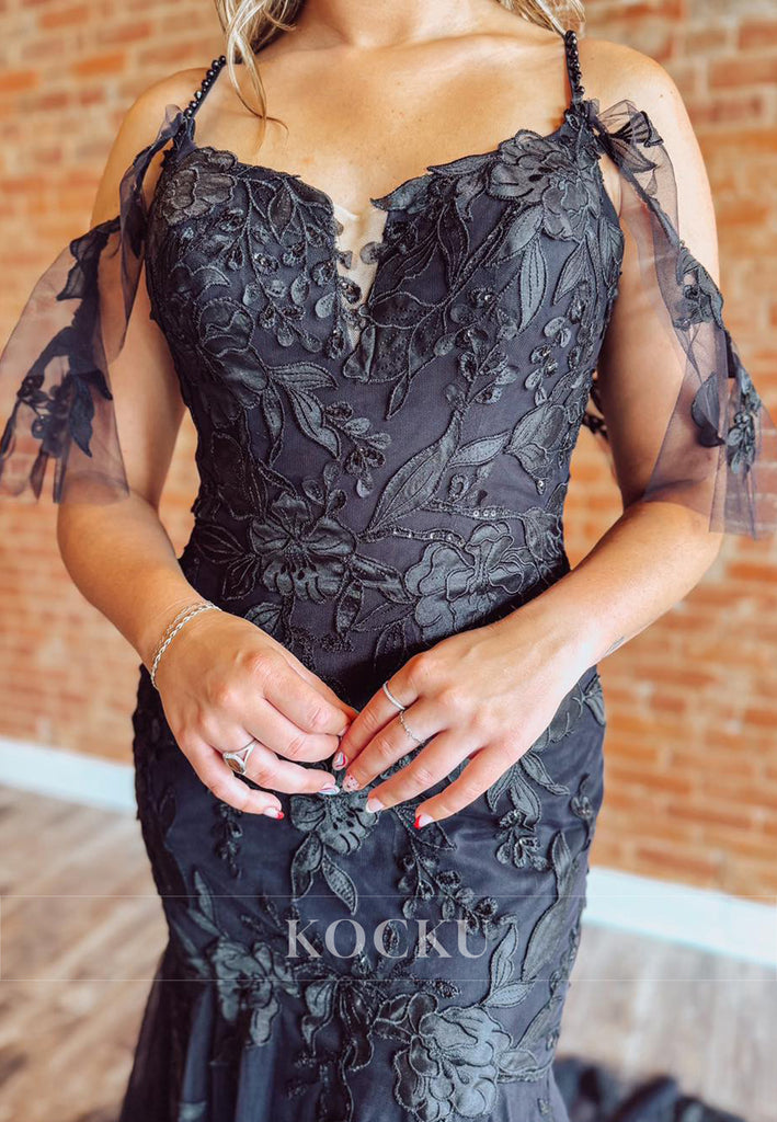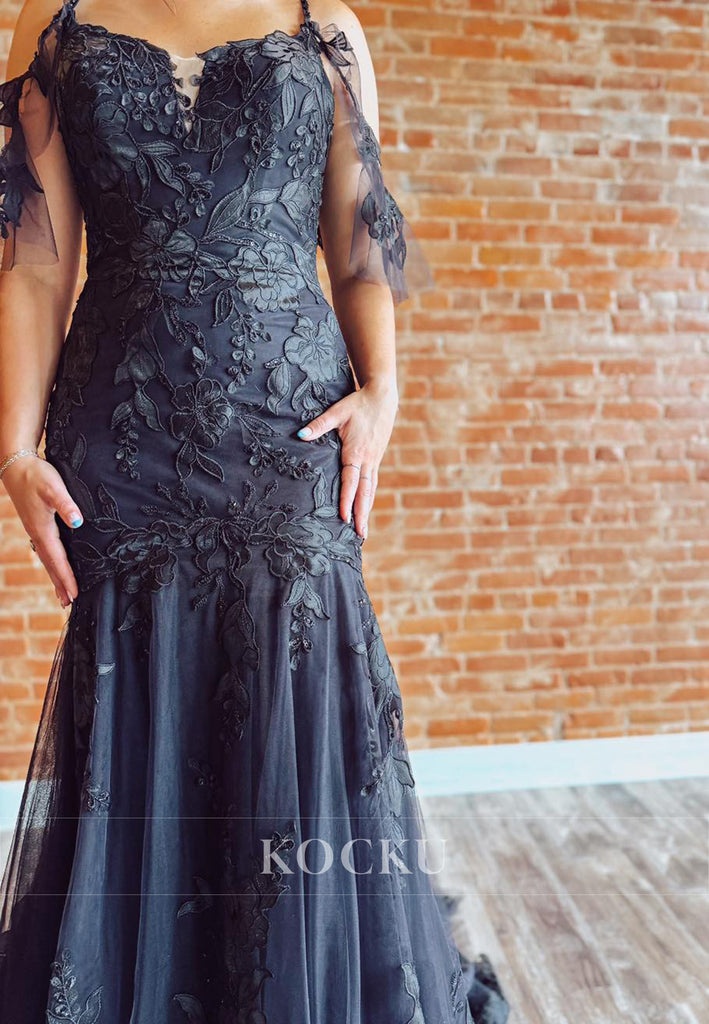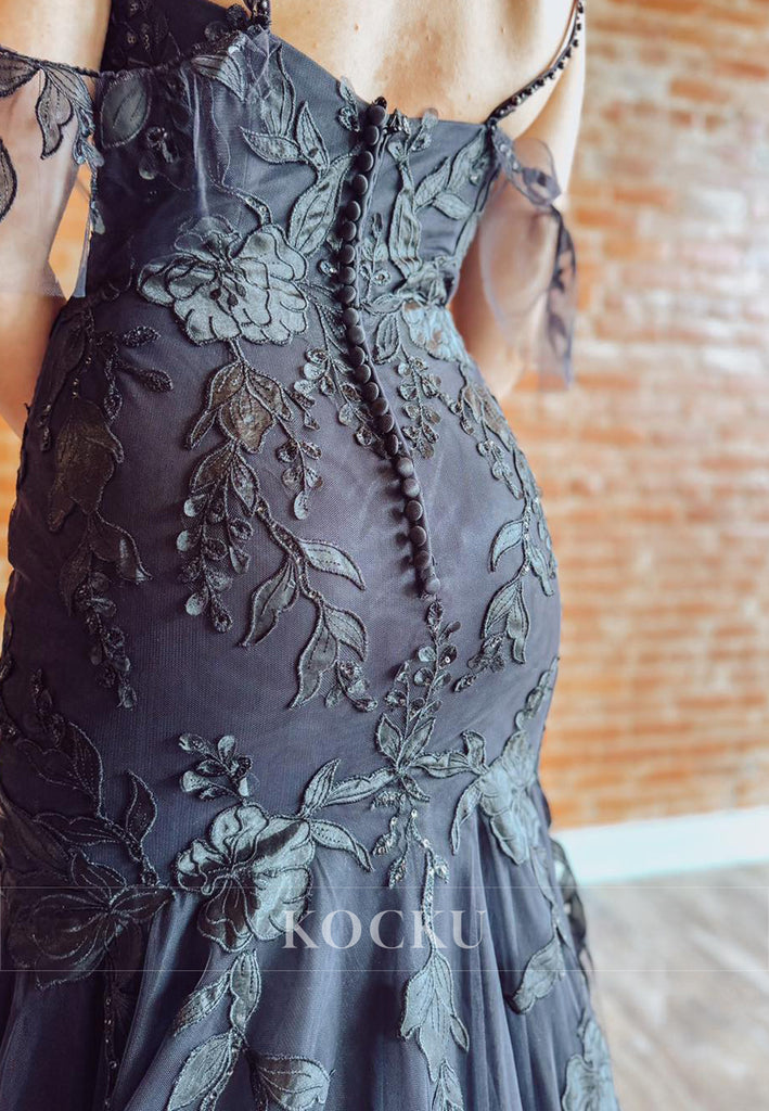 This mermaid wedding dress features delicate spaghetti straps and intricate lace appliques that enhance its elegant silhouette. The sweeping train adds a graceful finish, perfect for a bride seeking a timeless and sophisticated look. Crafted with attention to detail, this gown blends classic femininity with modern design for a memorable bridal statement.