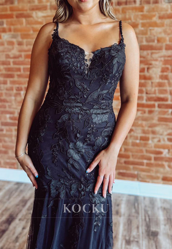 Spaghetti Straps Appliques Lace Mermaid Wedding Dresses with Sweep Train