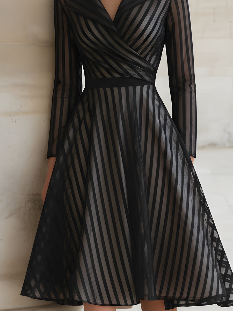- Design: The dress features a wrap-style bodice that flatters the waist and creates a sophisticated silhouette. The sheer striped design adds texture and dimension, while the long sleeves provide a balanced look. A collared neckline elevates the chic appeal of this dress.