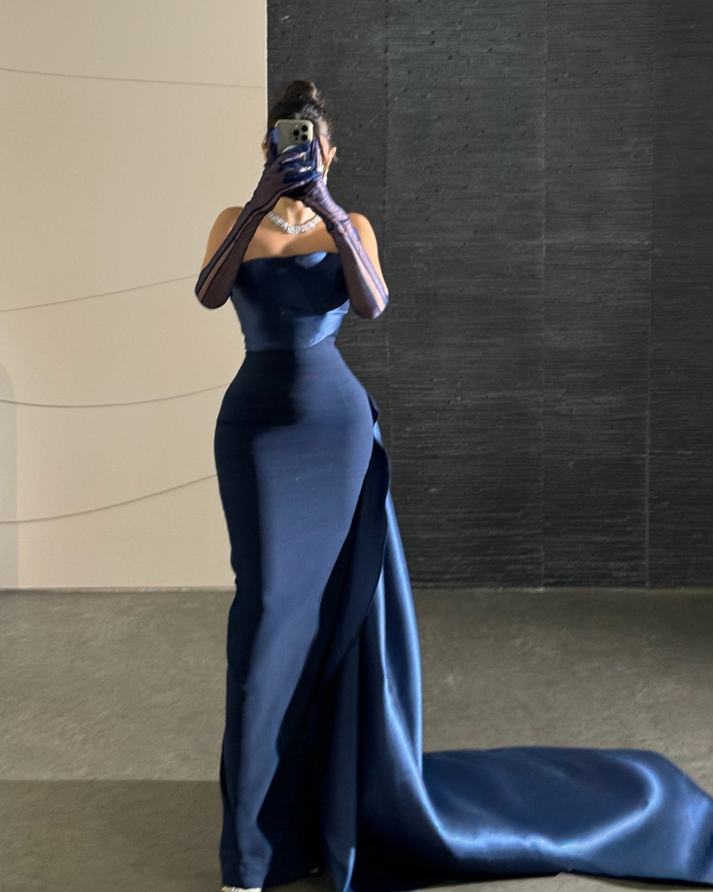 Make a bold statement in this striking navy evening dress that celebrates minimalist power. The sleek tube top design creates a clean, confident silhouette that puts you front and center—no distractions, just pure presence. Completely sleeveless, this dress showcases your shoulders and arms with fearless elegance, perfect for those who aren't afraid to bare it all. The fitted sheath cut accentuates your silhouette with precision, while the dramatic side train adds an unexpected flourish of movement and intrigue. This is understated sophistication with an edge—ideal for the woman who knows that sometimes less is more, but never means settling for ordinary. Own every moment in this timeless yet daring piece.