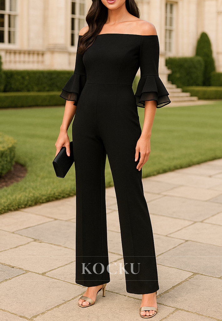 Black - Off the Shoulder Half Bell Sleeves Mother of Bride Jumpsuit