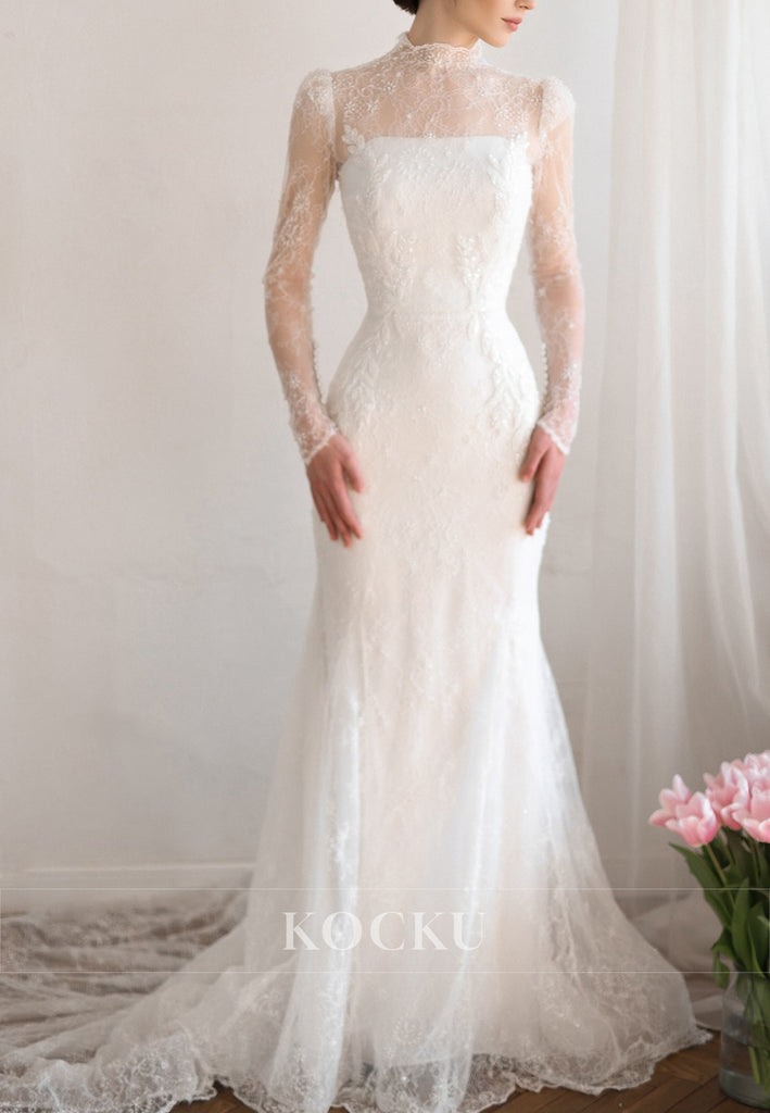 Appliques Lace - Long Sleeve Illusion Neck Mermaid Wedding Dresses