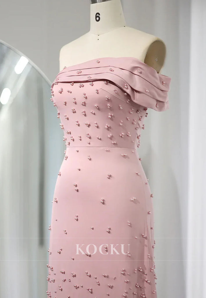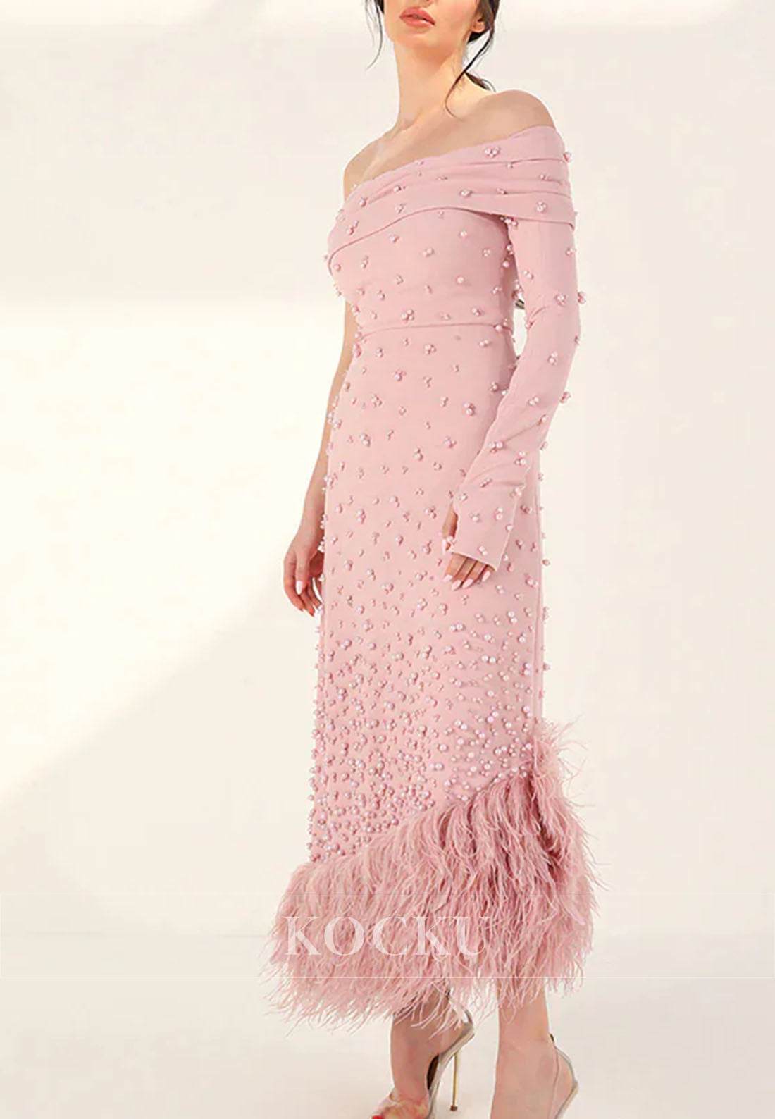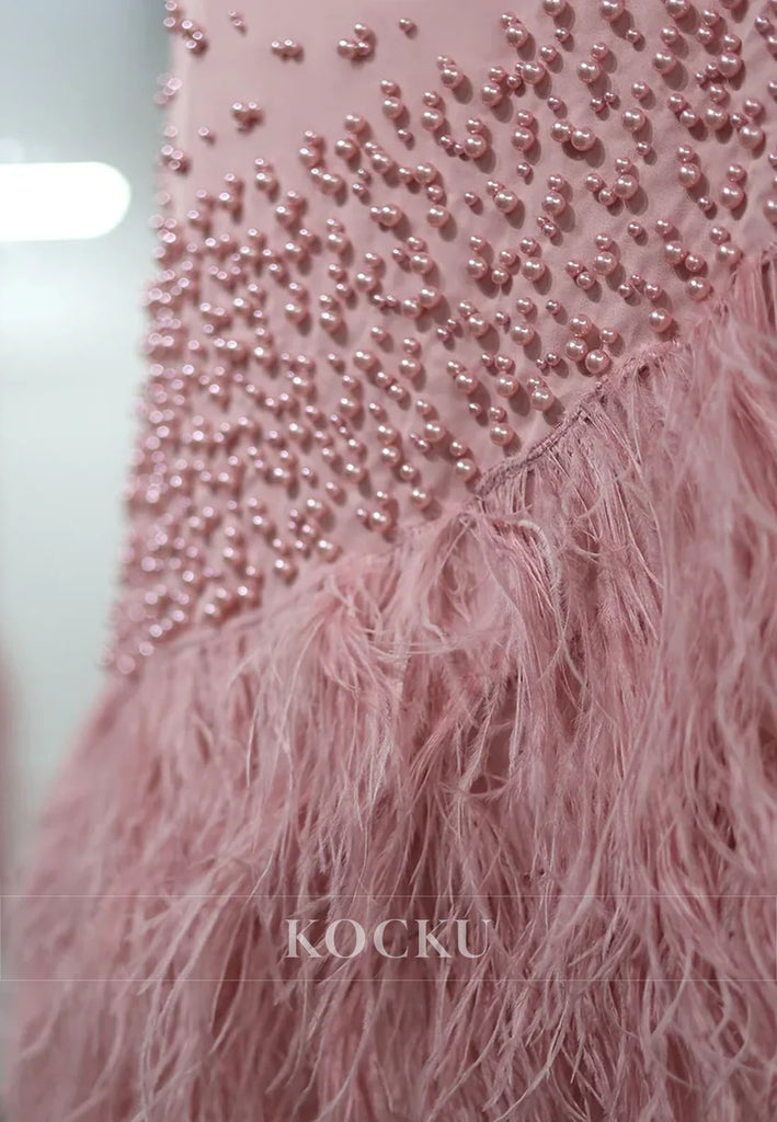 Feathers Beaded One Shoulder Sheath Tea Length Evening Dress - Pink is backordered and will ship as soon as it is back in stock.