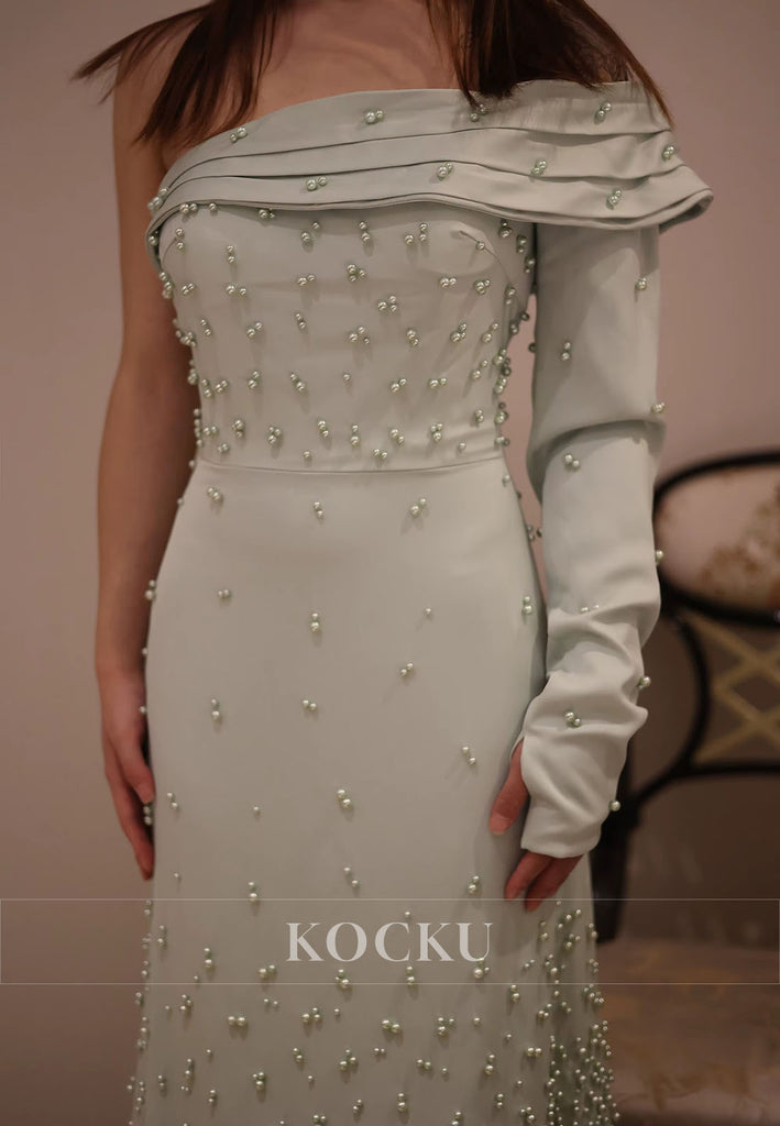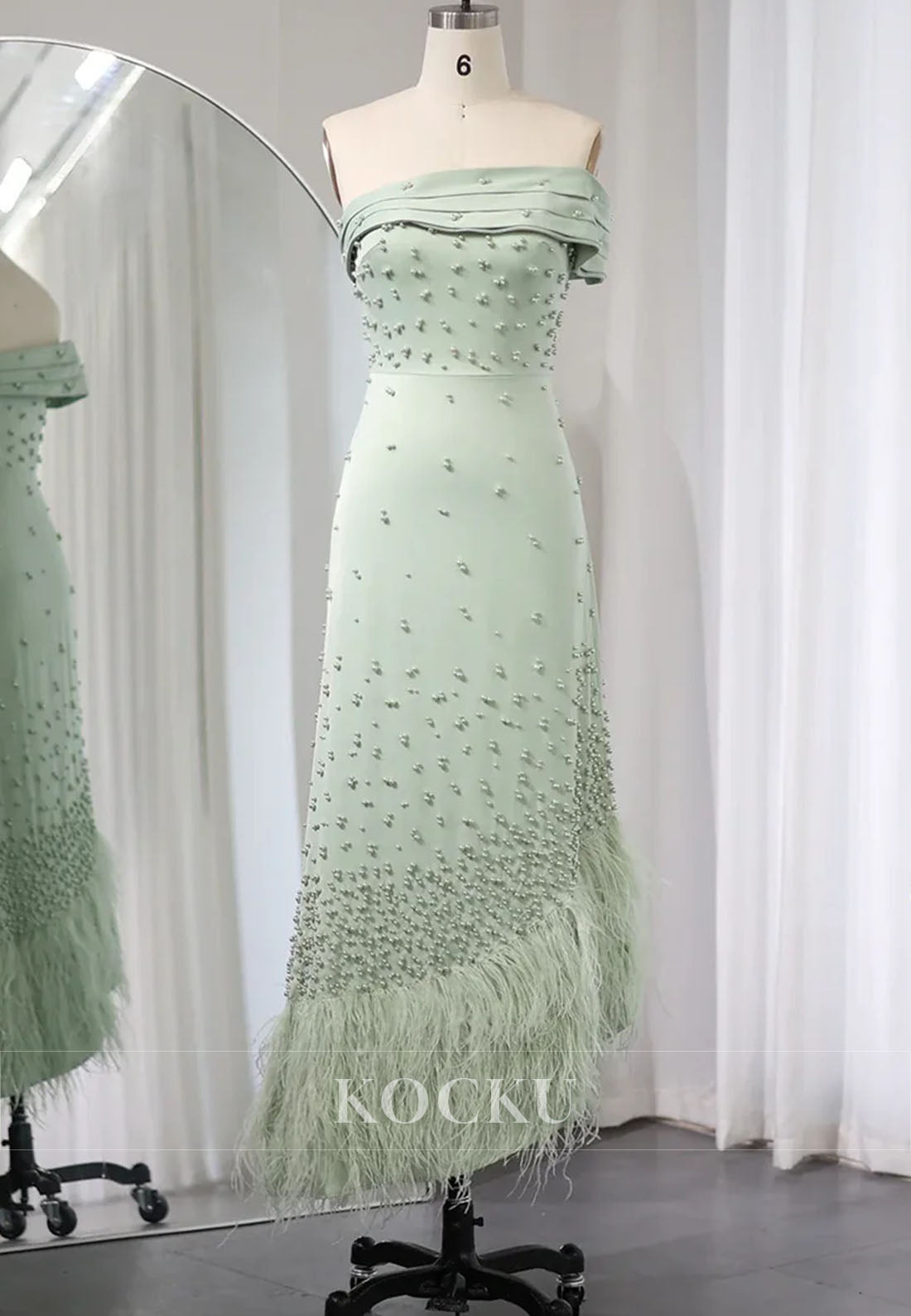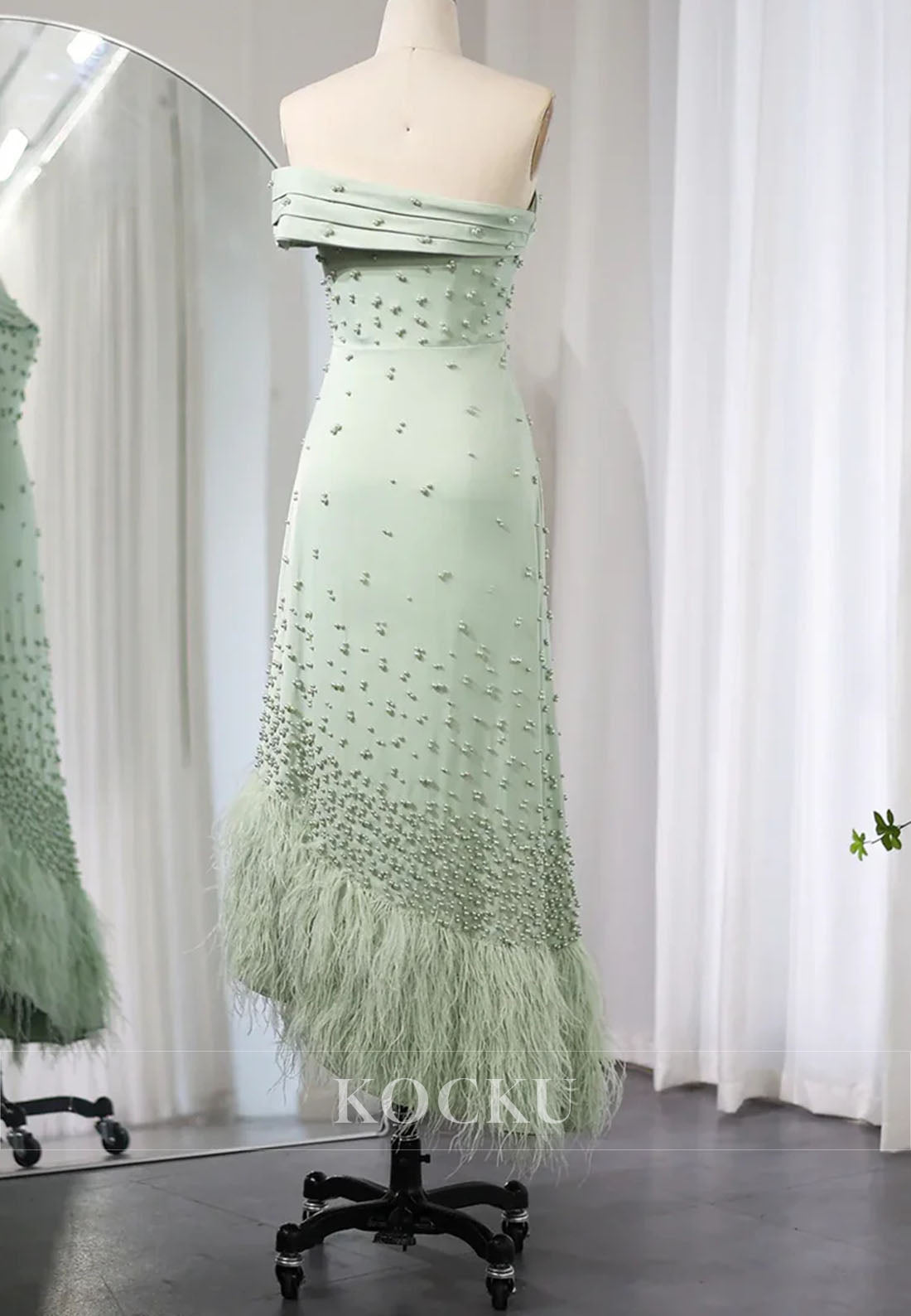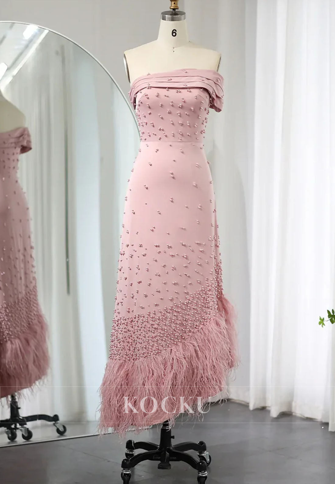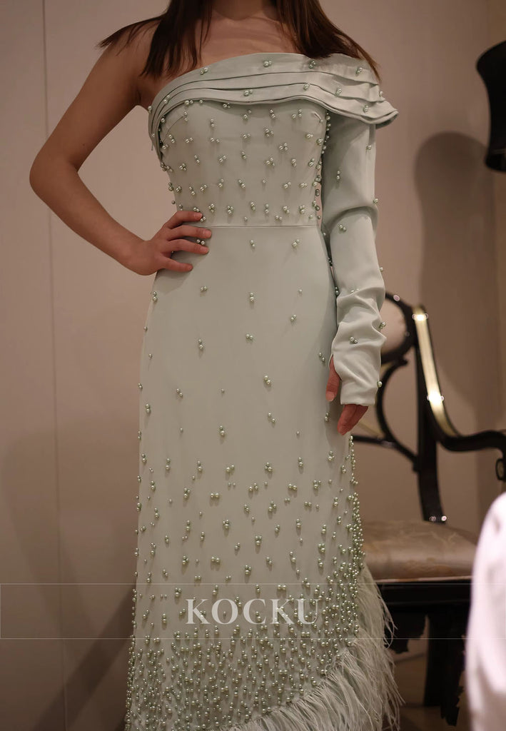 Elevate your evening elegance with this sophisticated sheath dress, designed for the discerning guest. The striking one-shoulder silhouette creates a modern, asymmetrical neckline that commands attention, while delicate beading adds refined sparkle throughout. Luxurious feather accents provide textural dimension and movement, ensuring you stand out at any formal occasion. The tea-length cut strikes the perfect balance between classic and contemporary, offering a flattering fit that transitions seamlessly from cocktail hour to dinner. Crafted for those who appreciate understated glamour with architectural detail, this dress delivers timeless style with a contemporary edge.