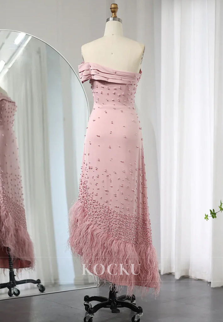 Feathers Beaded One Shoulder Sheath Tea Length Evening Dress