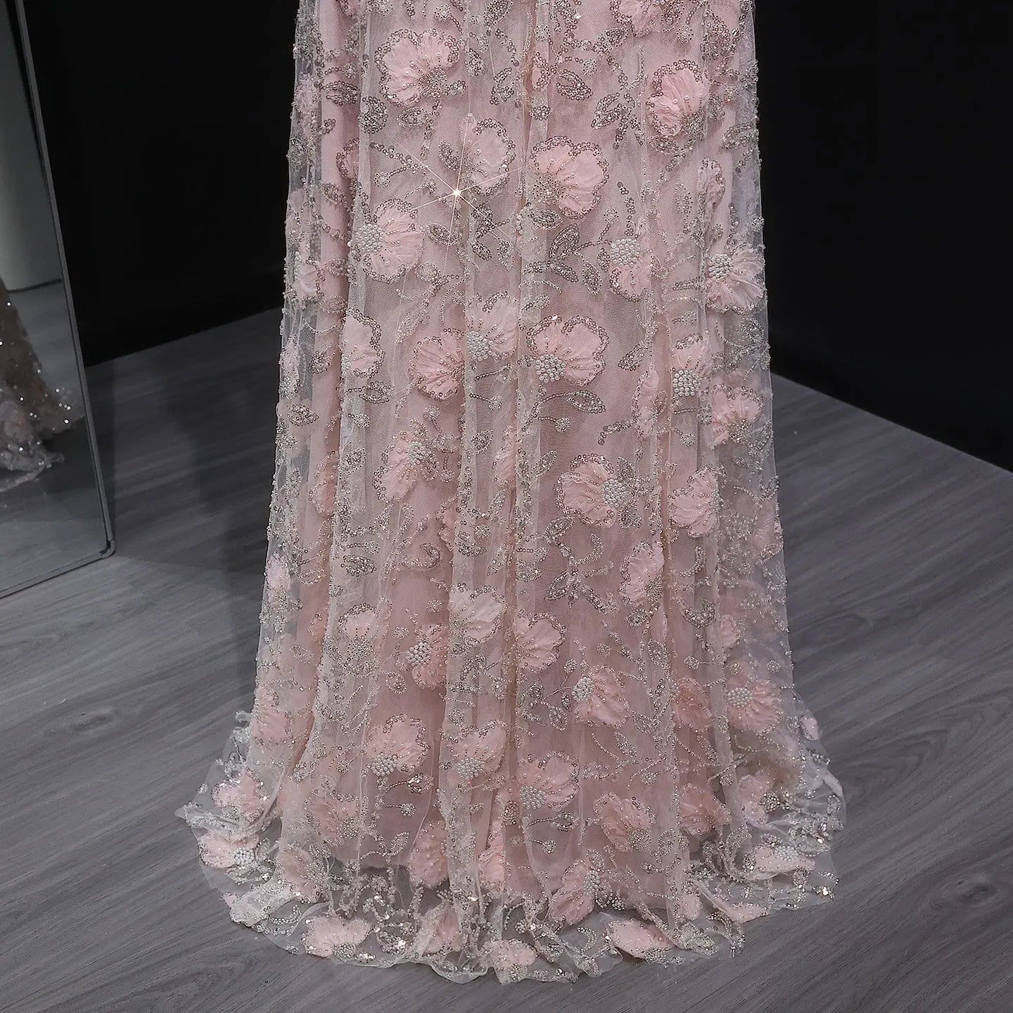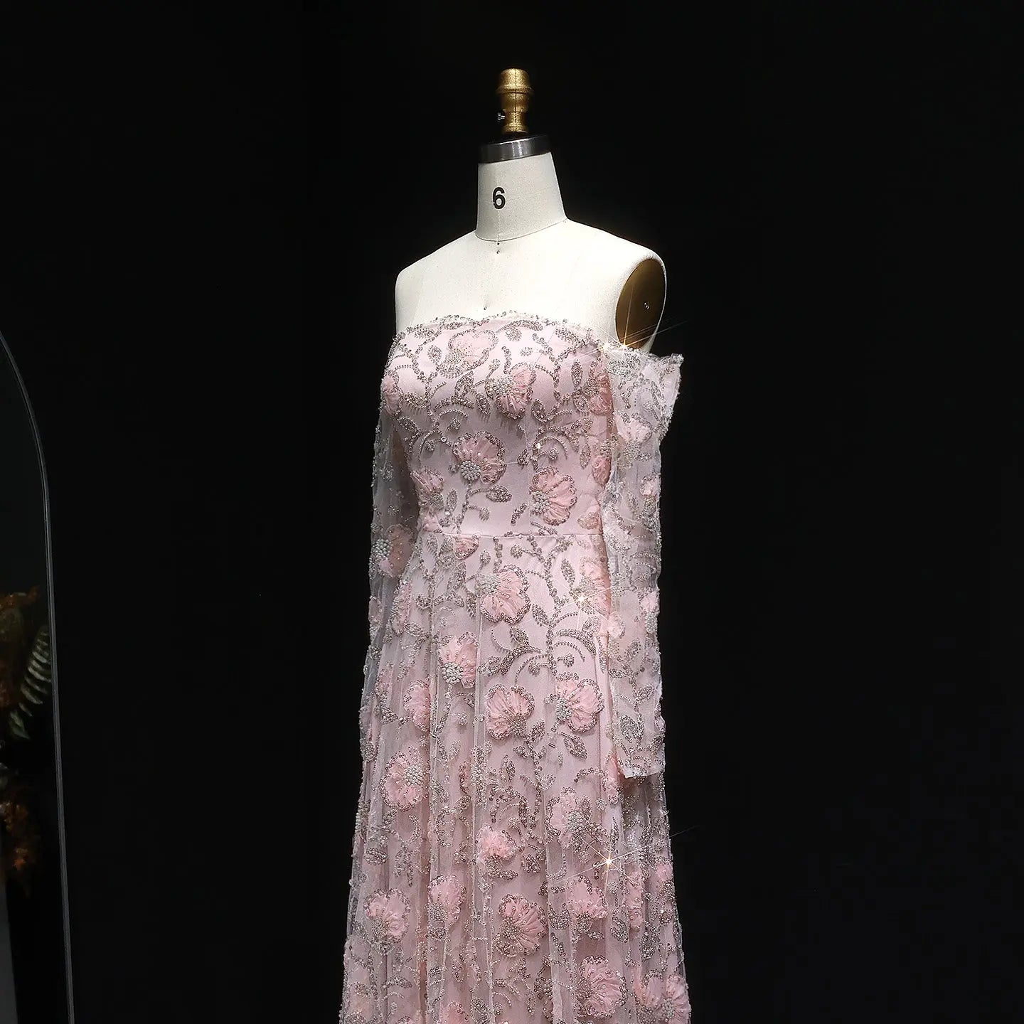 This elegant pink evening dress features delicate long sleeves adorned with intricate beadwork and embroidery, creating a refined and graceful silhouette. Perfect for formal occasions, its sophisticated design enhances your presence with subtle shimmer and timeless style.