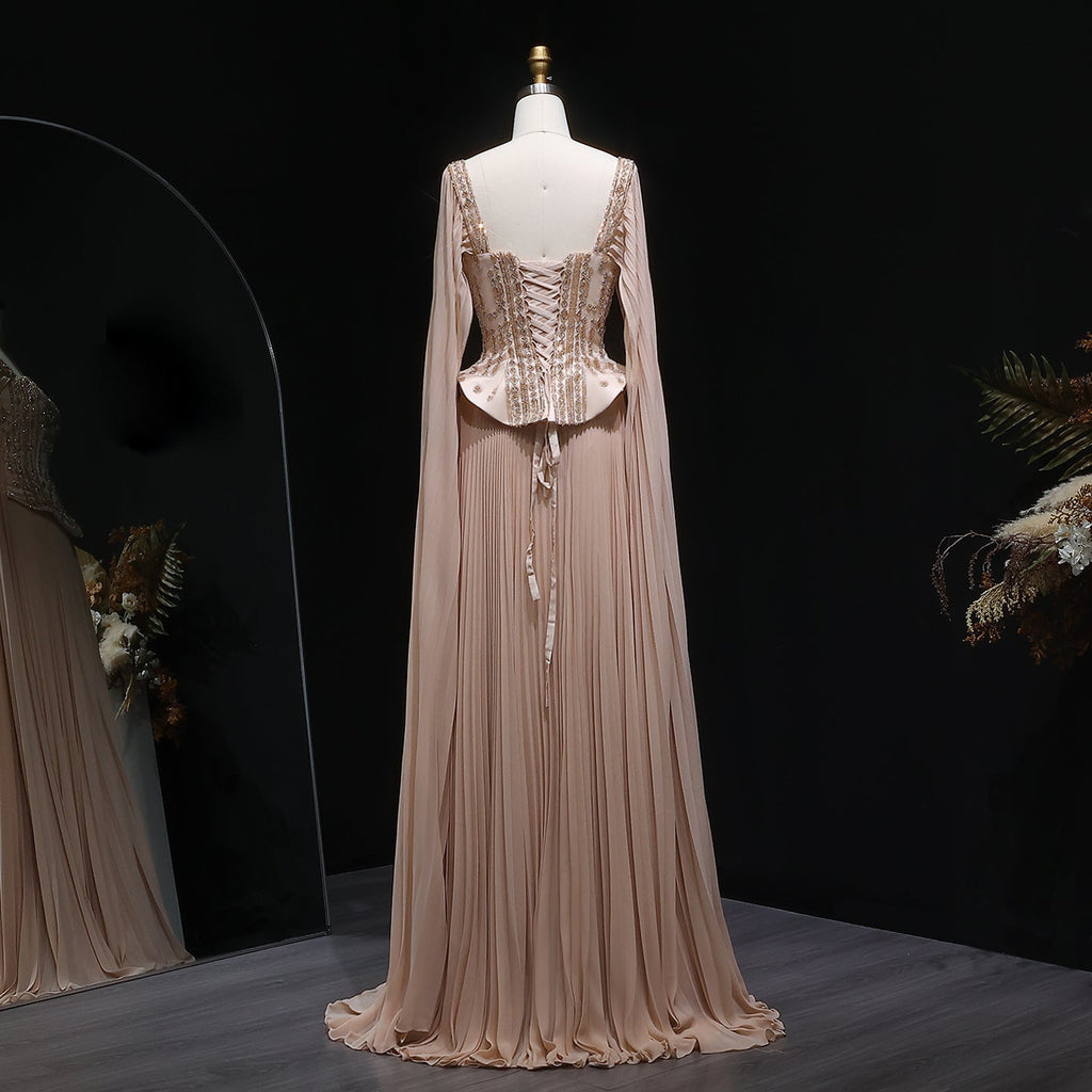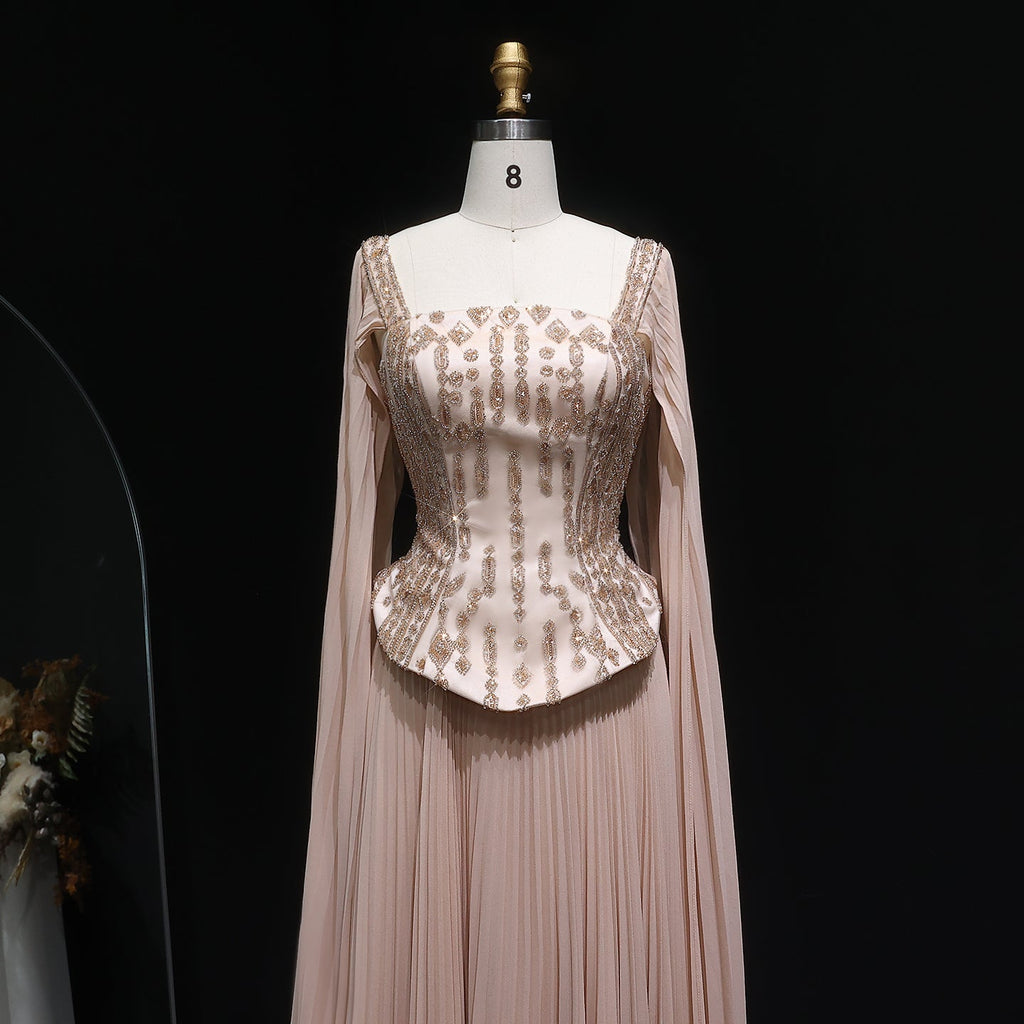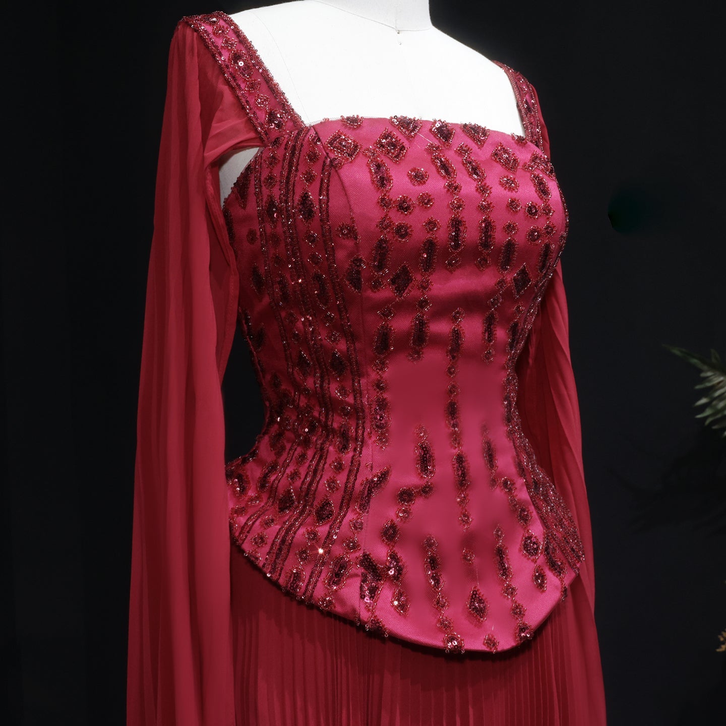 Elegant Wine Red Beaded Corset Evening Dress with Cape Sleeves