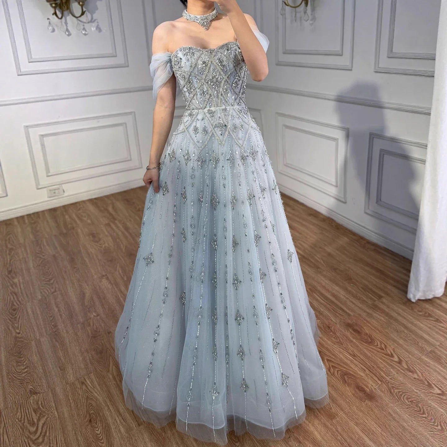 Luxury Gray Blue A-Line Dreamy Beaded Evening Dress With Necklace