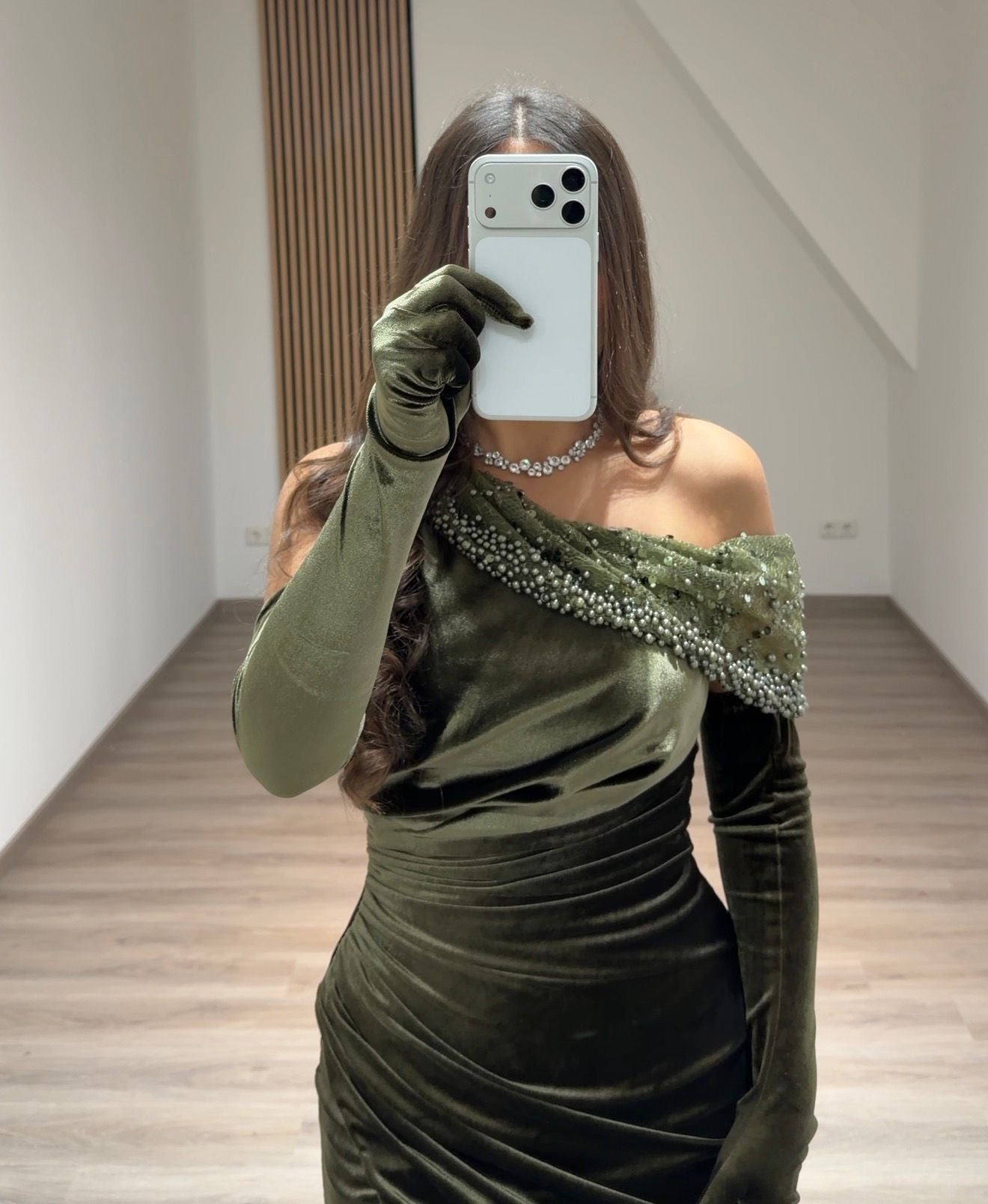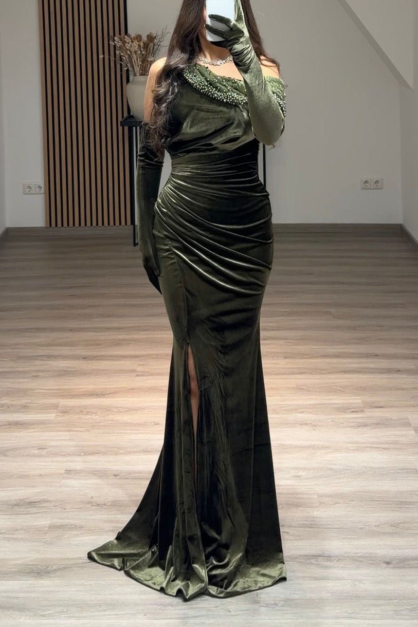 Make a striking entrance in this sophisticated green evening gown. The elegant one-shoulder neckline and flowing long sleeves create a timeless silhouette, while intricate beading adds glamorous detail. Ruching along the side accentuates your curves, and the dramatic mermaid cut with a thigh-high slit ensures graceful movement. Perfect for formal events, galas, and unforgettable nights.