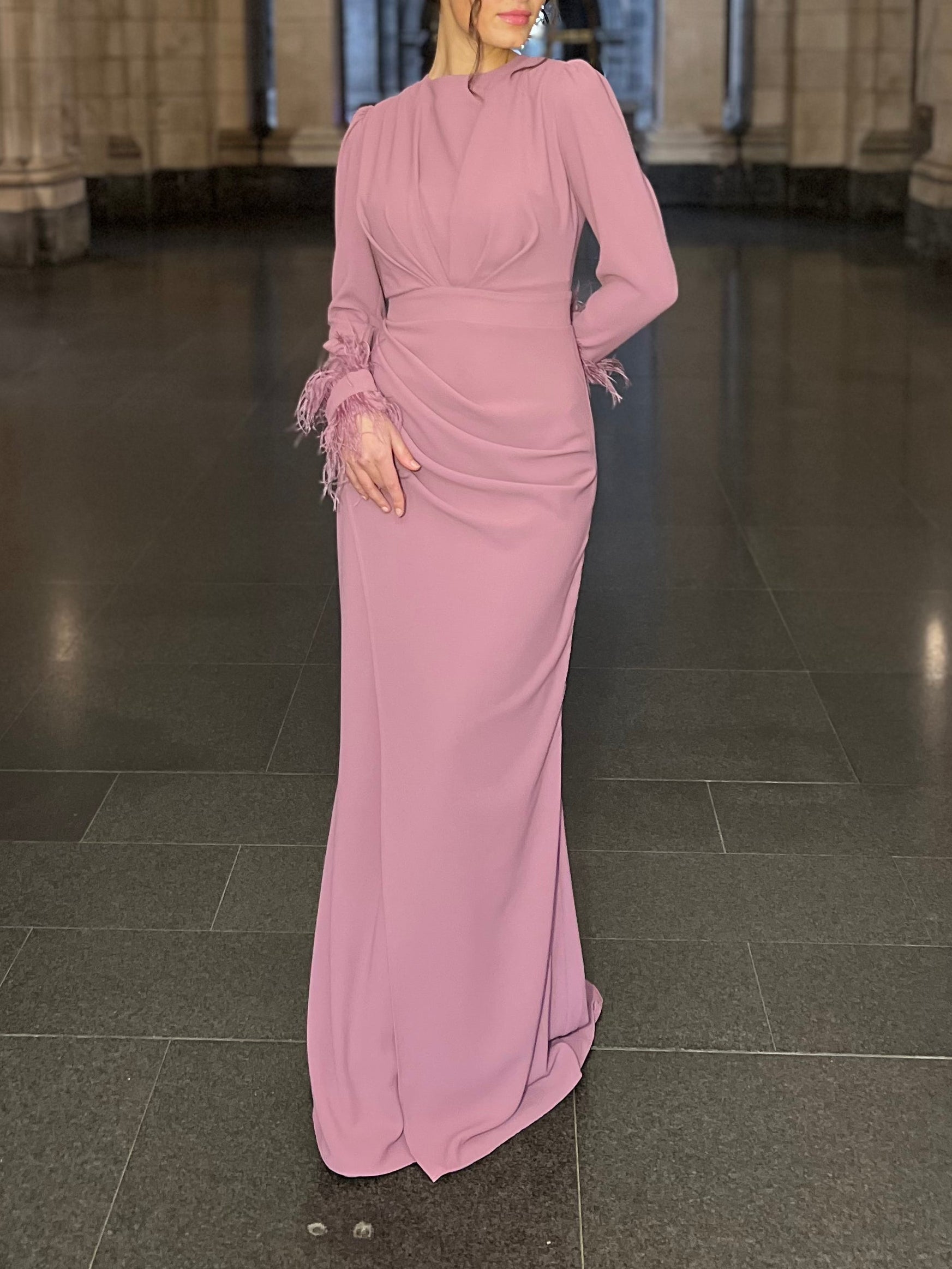 Elevate your formal wardrobe with this sophisticated dusty rose sheath dress, designed for refined elegance. The ruched detailing creates flattering dimension while the long sleeves offer timeless coverage. A discreet back zipper ensures a seamless silhouette and effortless wear. Perfect for evening galas, cocktail events, or upscale celebrations, this dress combines classic construction with contemporary styling for a polished, memorable appearance.