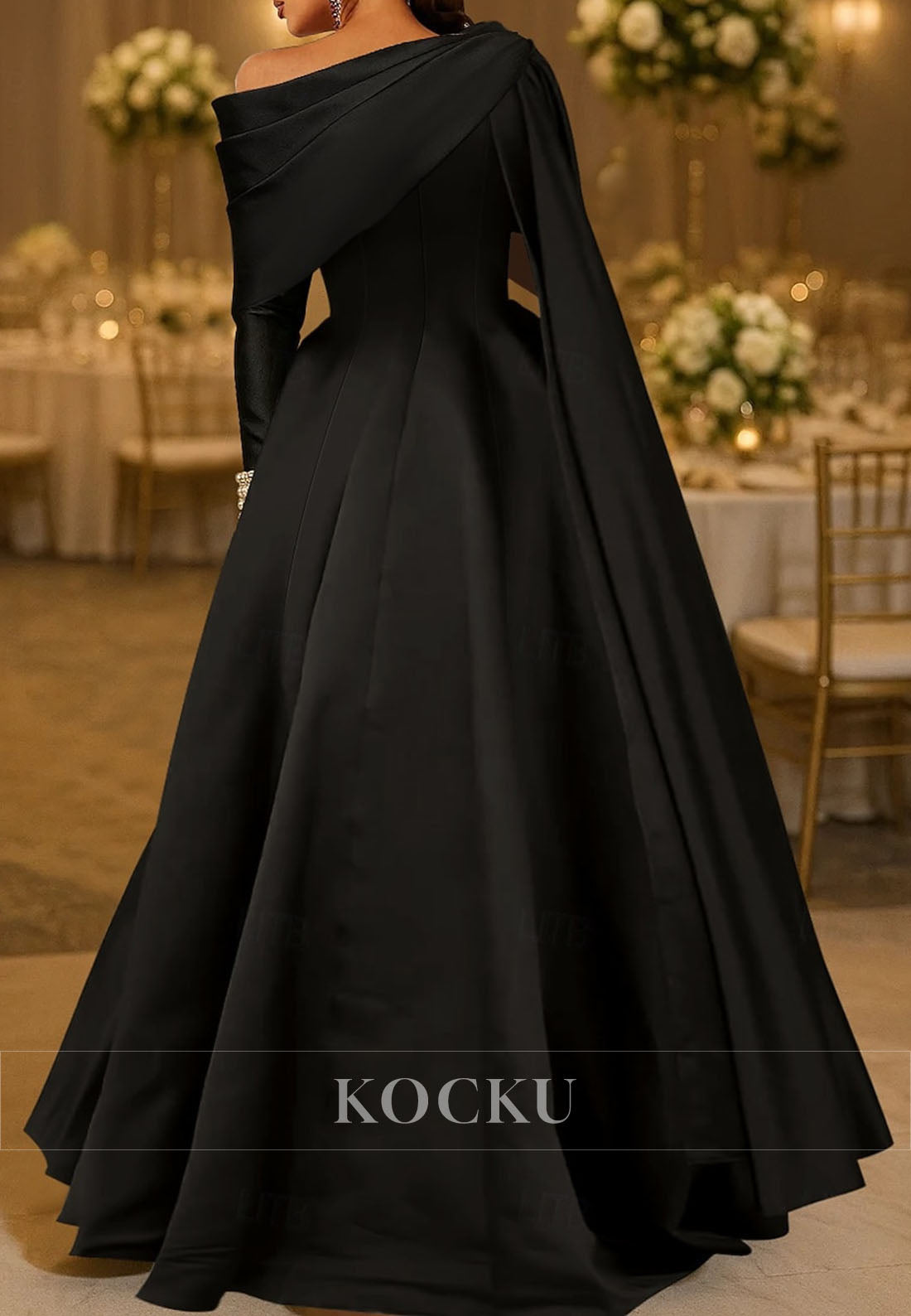 This elegant A-Line satin evening dress features a one shoulder design for a sophisticated look. With ruched detailing and a floor length silhouette, it is perfect for any special occasion. Designed specifically for mothers of the bride, this dress is both stylish and comfortable for all night wear.
