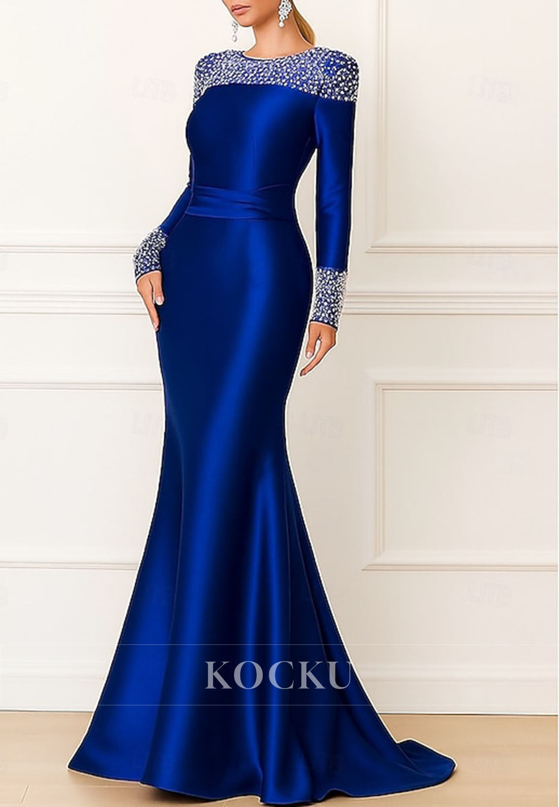 Mermaid Bateau Neck Long Sleeves Beade Satin Evening Gown Mother of the Bride Dress - Royal Blue is backordered and will ship as soon as it is back in stock.