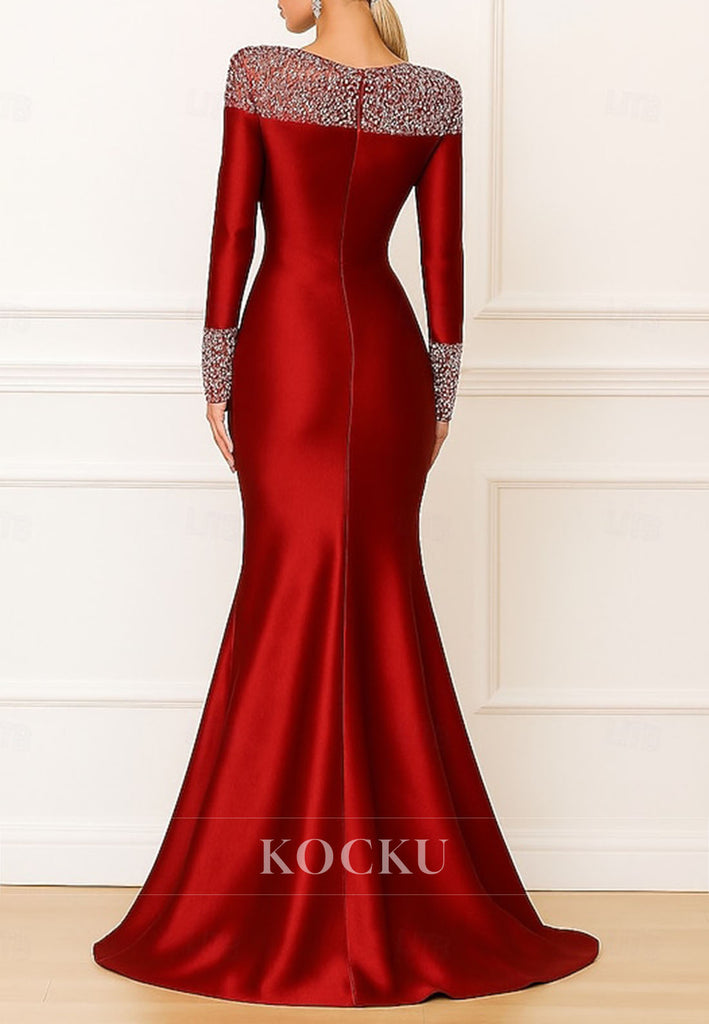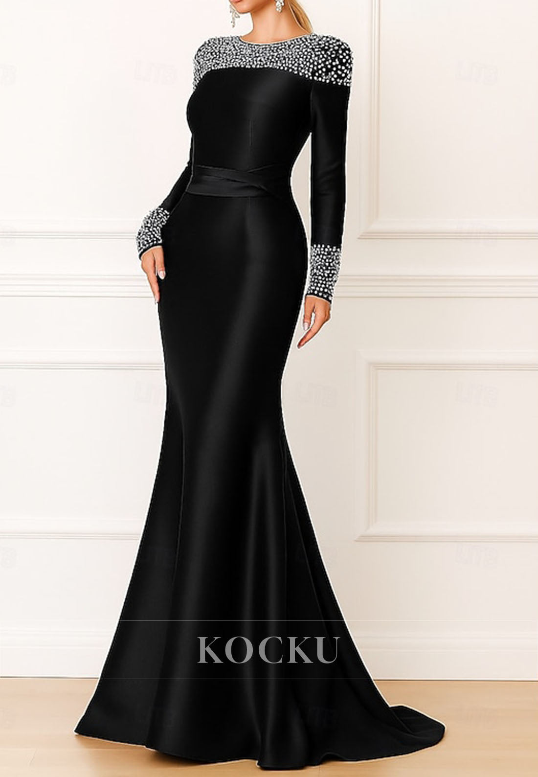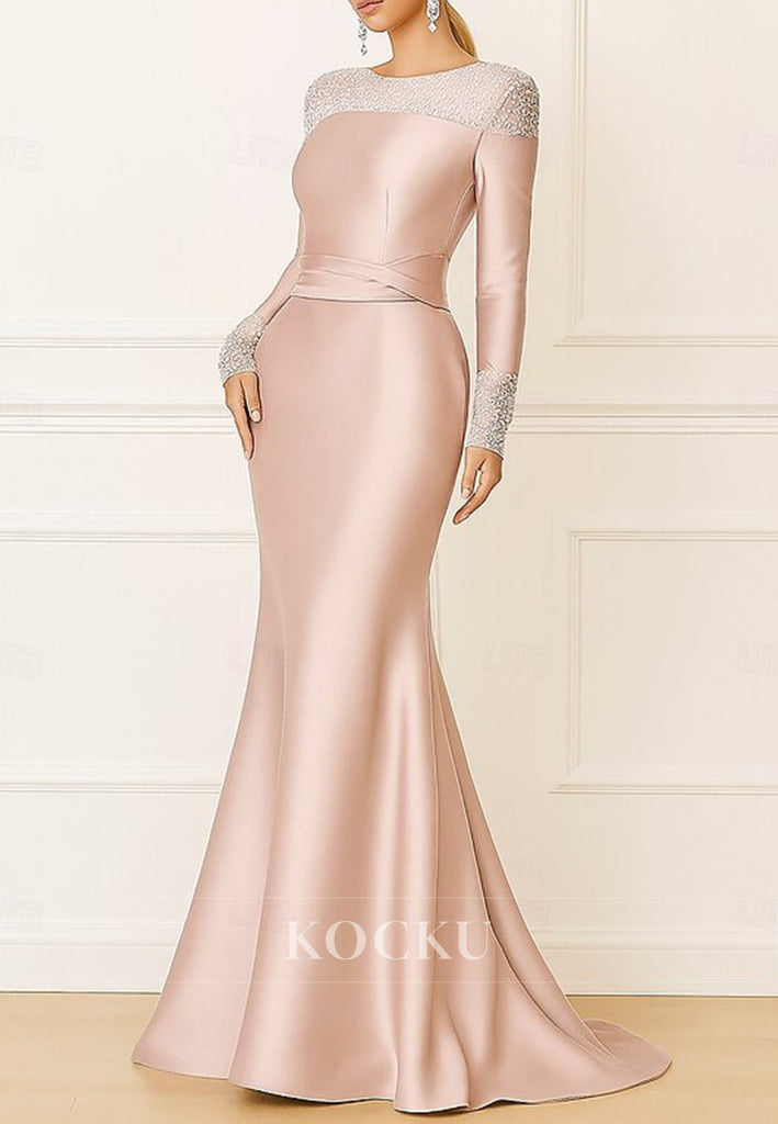 Mermaid Bateau Neck Long Sleeves Beade Satin Evening Gown Mother of the Bride Dress
