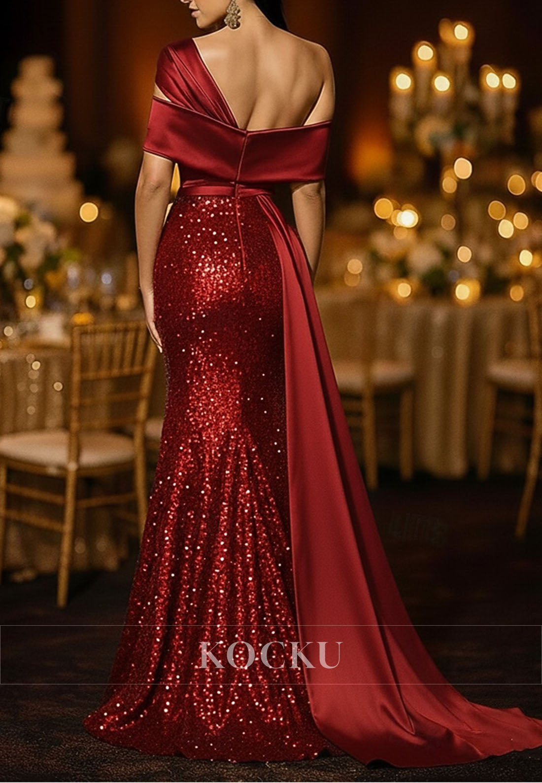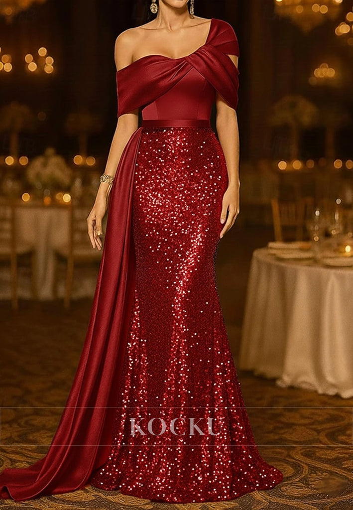 Mermaid One Shoulder Ruched Sequins Back Zipper Mother of the Bride Dress Evening Dress