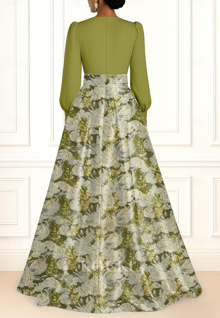 Command presence in this elegant A-line gown, thoughtfully designed for the mother of the bride. The refined V-neckline and full-length sleeves create a sophisticated silhouette with timeless appeal, while the gracefully flowing A-line cut provides flattering movement and comfort. A tasteful side slit adds contemporary allure and practical ease of movement, allowing you to navigate the celebration with grace. Extending to the floor, this floor-length gown delivers understated luxury and composed elegance. This expertly tailored dress perfectly balances classic design principles with subtle modern touches, ensuring you look poised and radiant throughout the occasion.