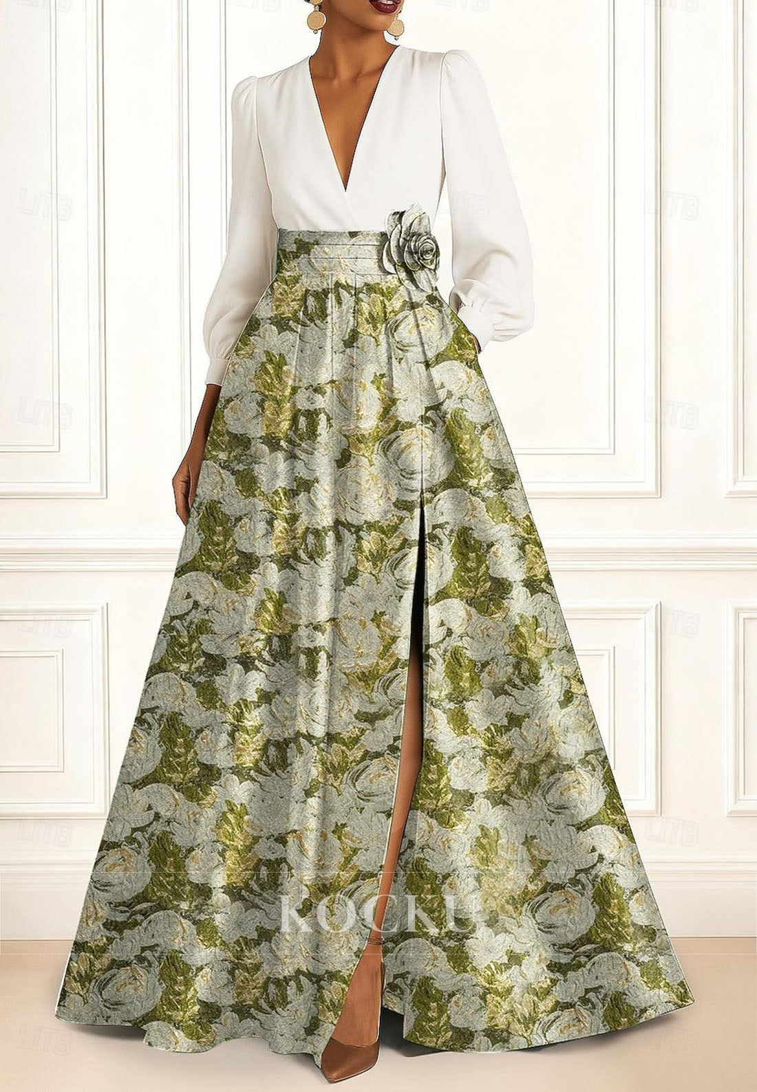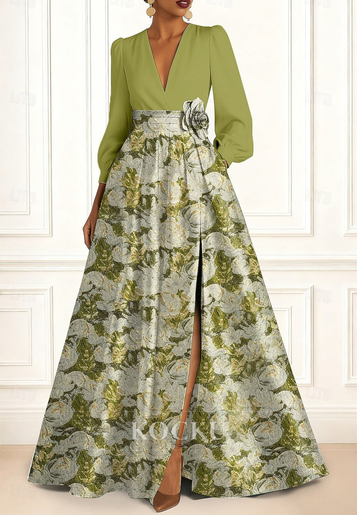 A-Line Long Sleeves V Neck Side Slit Floor Length Mother of the Bride Dress