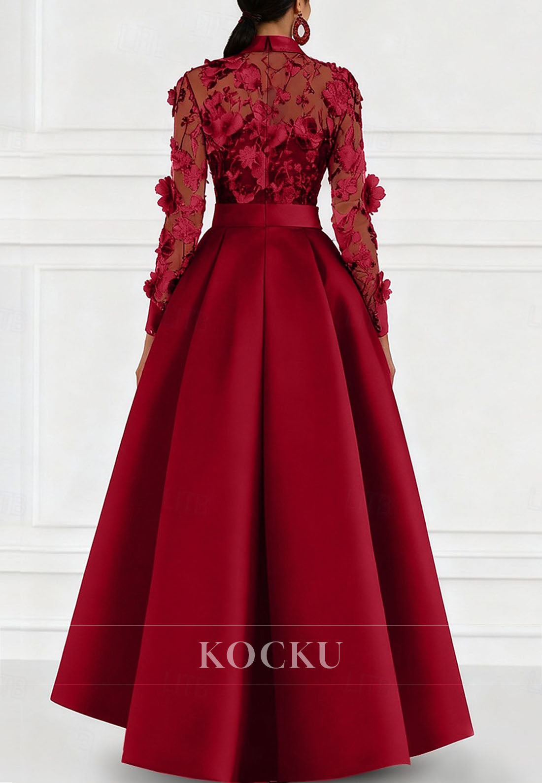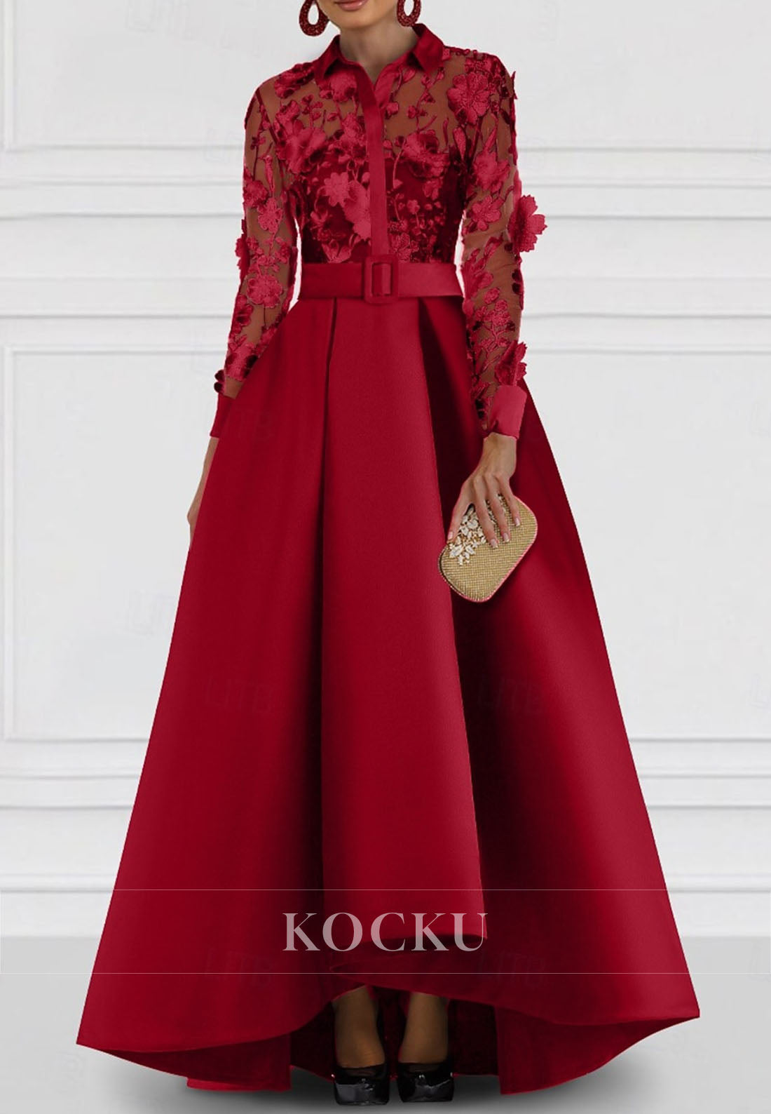 A-Line Floor Length Evening Gown Elegant Long Sleeve Shirt Collar Mother of the Bride Dress