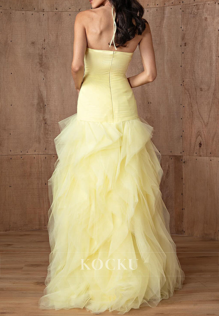 Chic & Modern Halter Sleeveless Tulle Sheath Long Prom Dresses - Yellow is backordered and will ship as soon as it is back in stock.