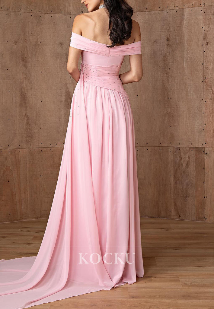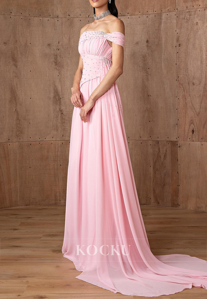 Off the Shoulder Pleated Rhinestone Embellished Prom Dresses with Sweep Train
