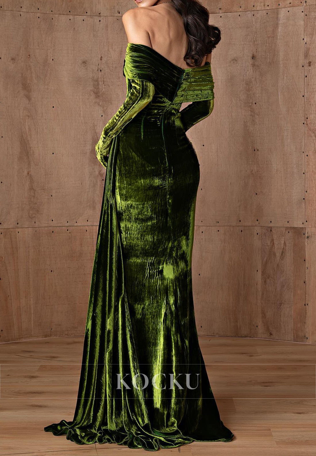 Long Sleeve Velvet Off the Shoulder Pleated Mermaid Prom Dresses - Green is backordered and will ship as soon as it is back in stock.