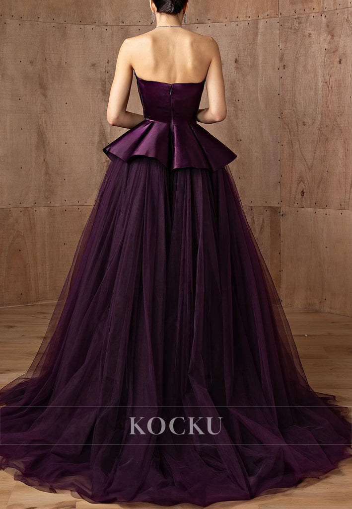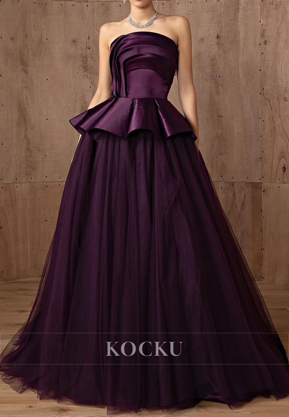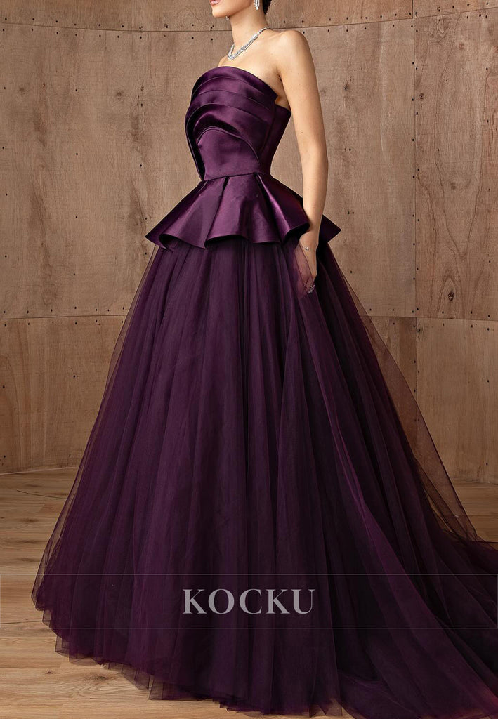 Grape A-Line Strapless Tulle Pleated Prom Dresses with Court Train