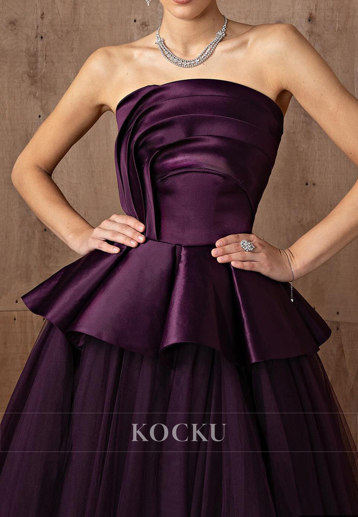 This grape-colored A-line prom dress features a strapless neckline and is crafted from layered tulle with delicate pleating for graceful volume and texture. The court train adds subtle drama and elegance, perfect for making a refined statement. Designed to flatter the silhouette, this dress offers a harmonious blend of classic charm and contemporary style for memorable formal occasions.