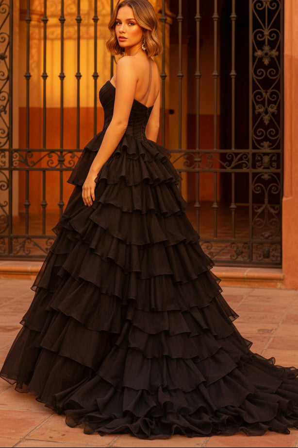 Make a stunning entrance in this elegant black A-line prom dress, designed to captivate. The structured corset bodice provides flattering support and definition, while cascading ruffle tiers create dramatic movement and dimension. Intricate beading details catch the light beautifully, adding glamour and refinement to every step. The flowing A-line silhouette elongates your frame for a graceful, timeless look perfect for prom night or any formal occasion.