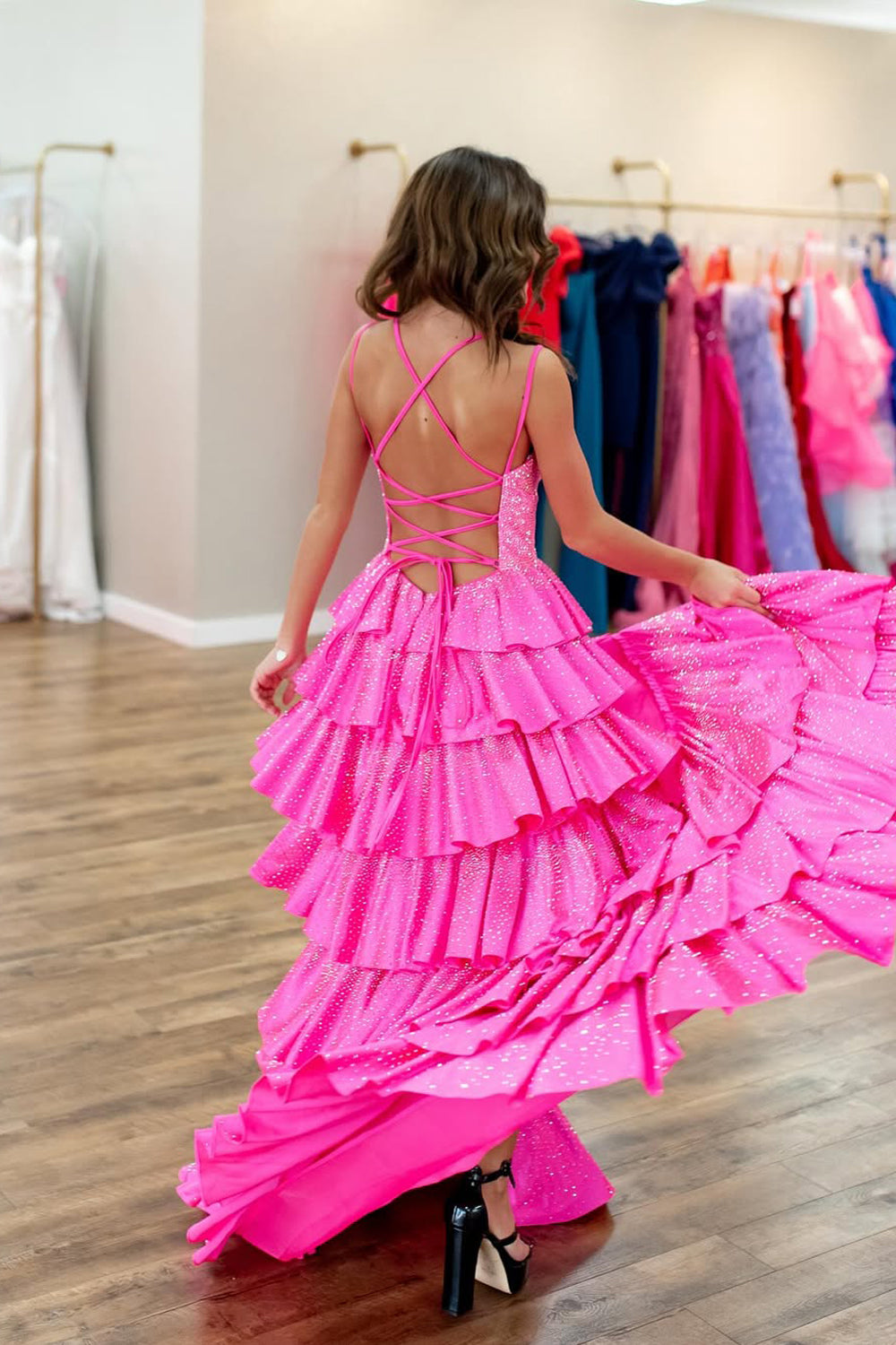 Elevate your prom night with this enchanting pink gown that seamlessly blends timeless elegance with contemporary glamour. The flattering A-line silhouette creates a graceful flow from the fitted bodice, while the plunging V-neckline adds refined sophistication. Cascading tiers build dimension and movement throughout the skirt, and shimmering hot stone embellishments catch the light with every step. Perfect for making an unforgettable entrance at your special event.