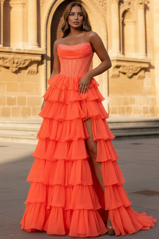 Gorgeous A Line Scoop Neck Orange Chiffon Tiered Prom Dress with Slit