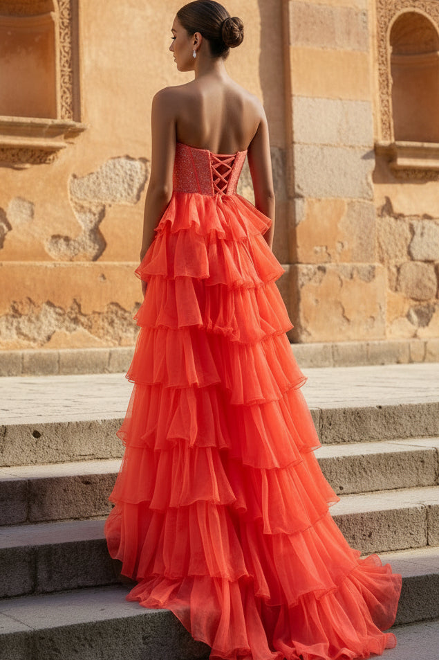 Elevate your prom night with this stunning A-line silhouette that flatters every figure. The delicate scoop neckline and flowing orange chiffon create an effortlessly elegant look, while the tiered layers add graceful movement and dimension. A subtle slit provides modern sophistication and ease of movement. Perfect for making a memorable entrance, this dress combines classic prom glamour with contemporary design details that ensure you'll stand out for all the right reasons.
