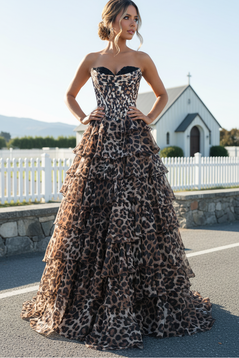 This stunning A-line prom dress combines timeless elegance with contemporary flair. The sweetheart neckline flatters the décolletage while the leopard print adds a bold, fashion-forward statement. Tiered layers create dynamic movement and dimension, while the strategically placed slit offers both sophistication and ease of movement. Perfect for making an unforgettable entrance at prom, formal events, or special occasions where you want to stand out with refined style and confidence.