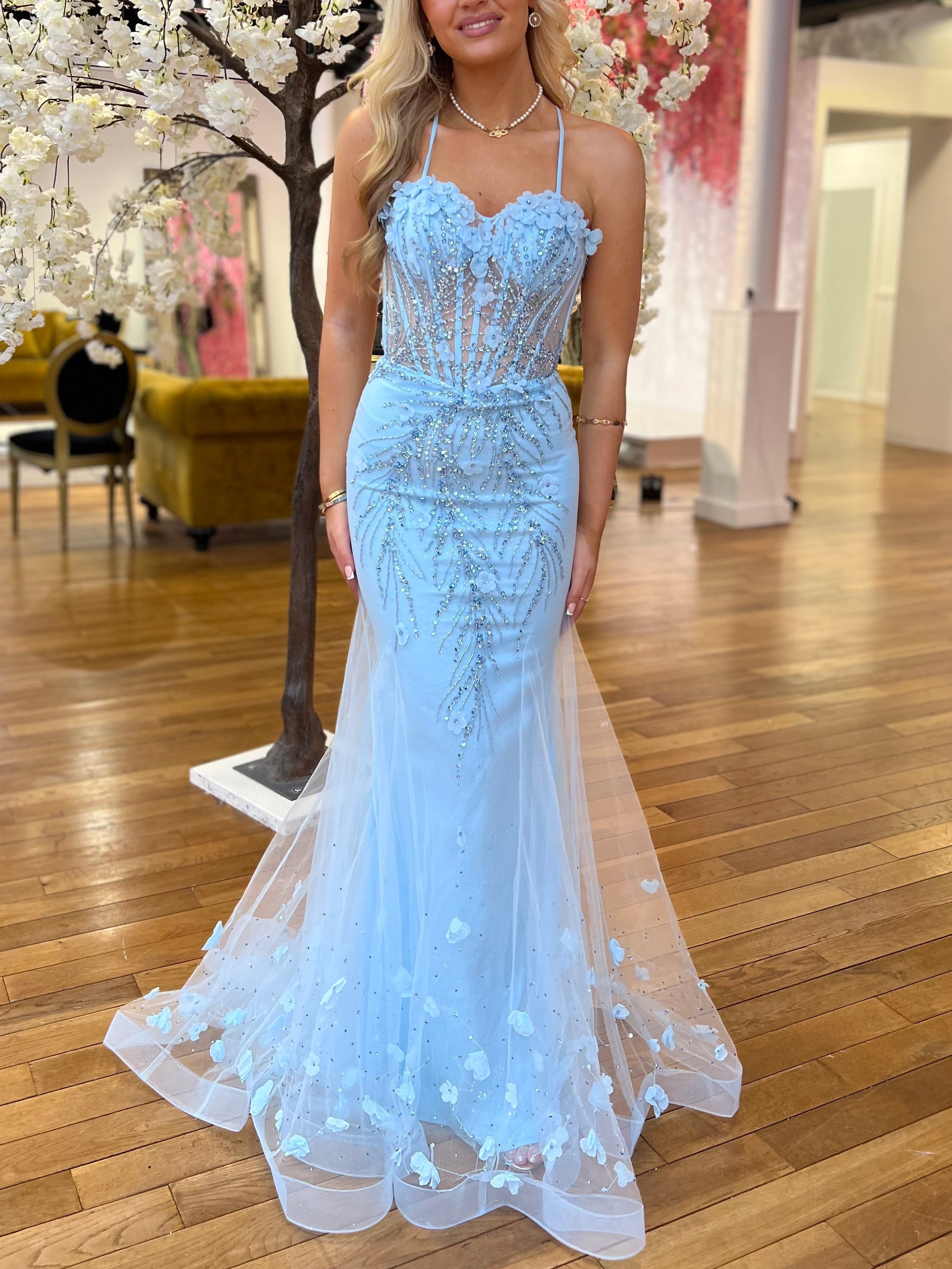 Baby Blue Sweetheart Spaghetti Straps Appliques Mermaid Prom Dress - Baby Blue is backordered and will ship as soon as it is back in stock.