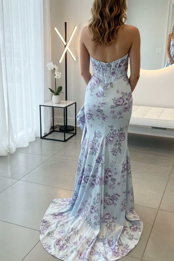 Mermaid Strapless Blue Floral Printed Satin Ruffled Long Prom Dresses with Slit
