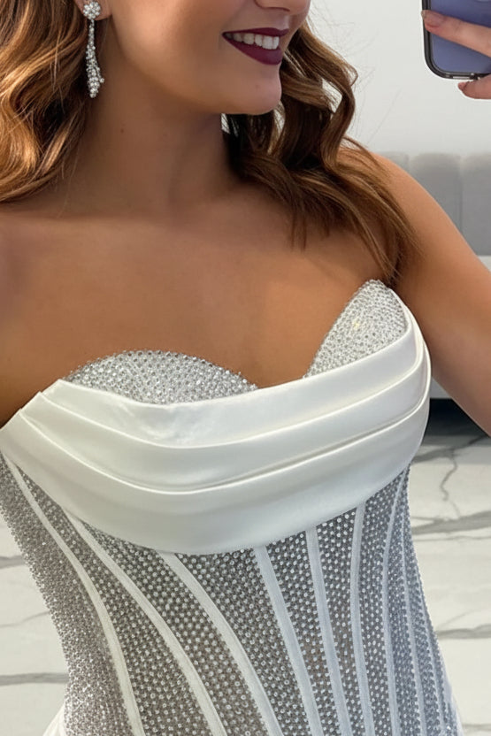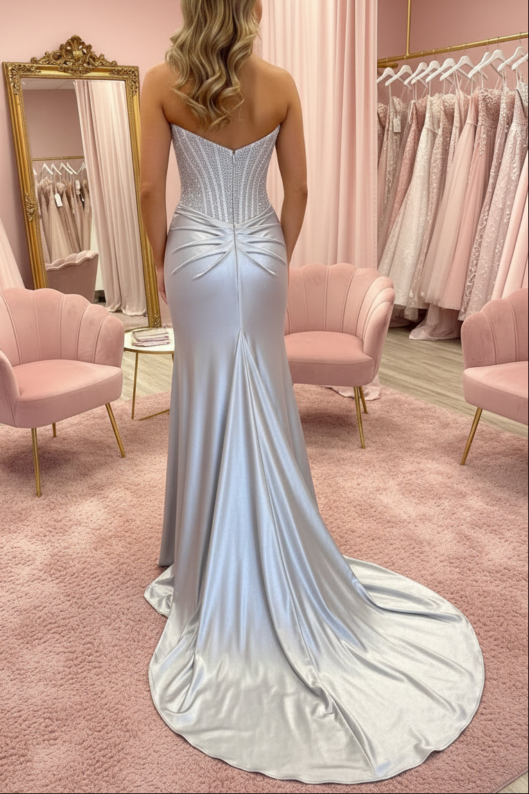 Elevate your prom night with this stunning mermaid silhouette gown. Crafted from luxurious gold satin, the strapless design showcases intricate beading that catches the light with every movement. The floor-length cut features a graceful slit that adds both elegance and ease of movement. Perfect for making an unforgettable entrance, this dress combines timeless sophistication with contemporary glamour, ensuring you feel confident and radiant throughout the evening.