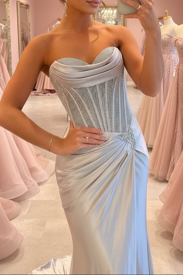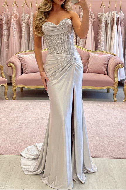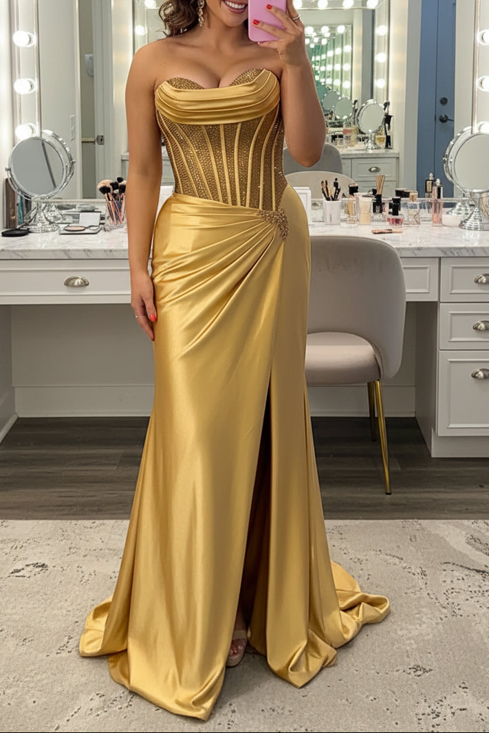 Mermaid Strapless Gold Satin Beaded Long Prom Dresses with Slit