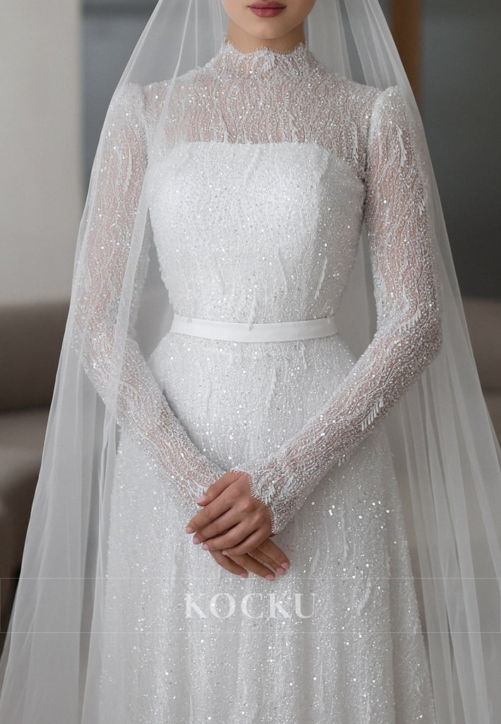 High Neck - Long Sleeve Sequins Beaded Sheath Wedding Dresses