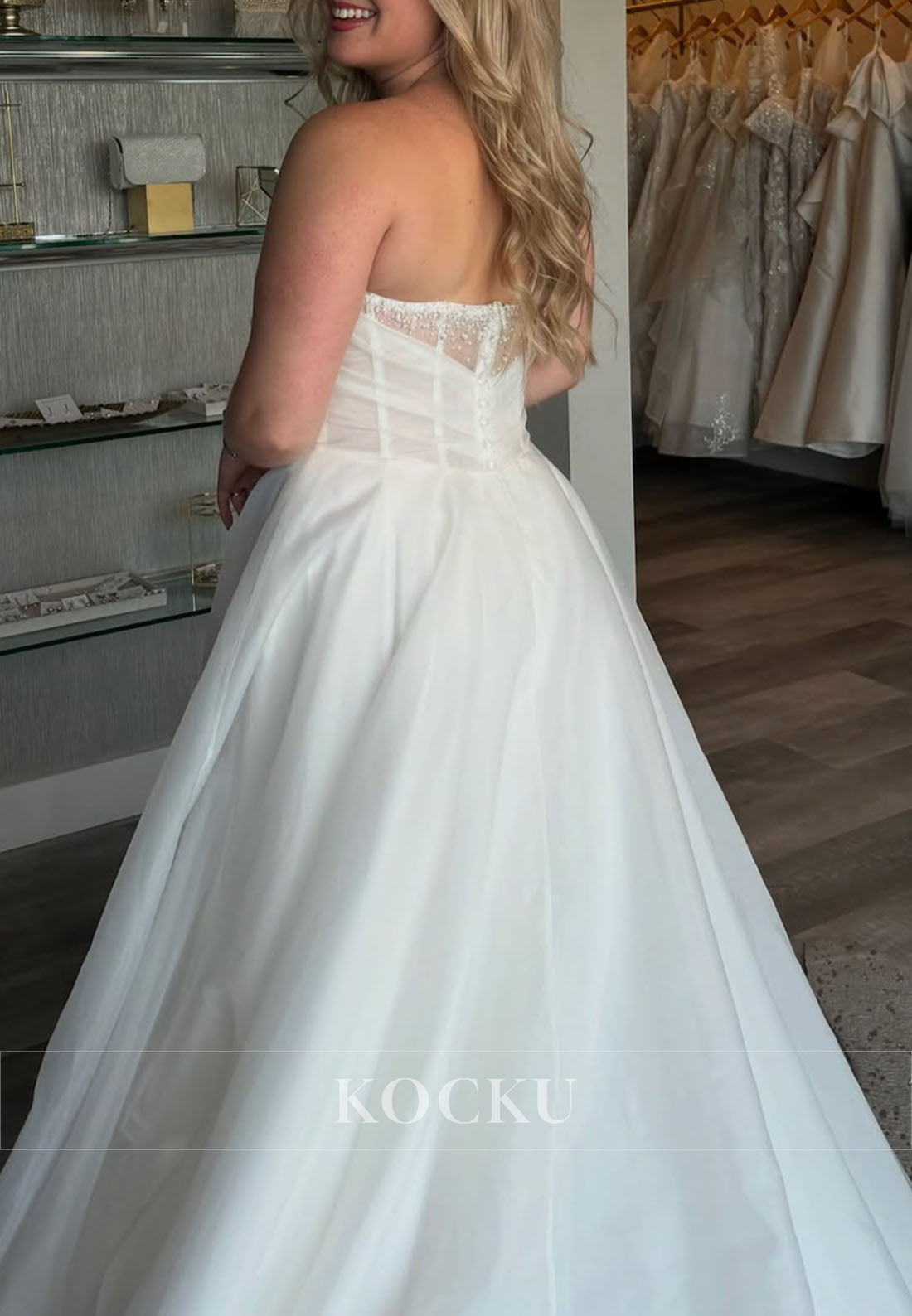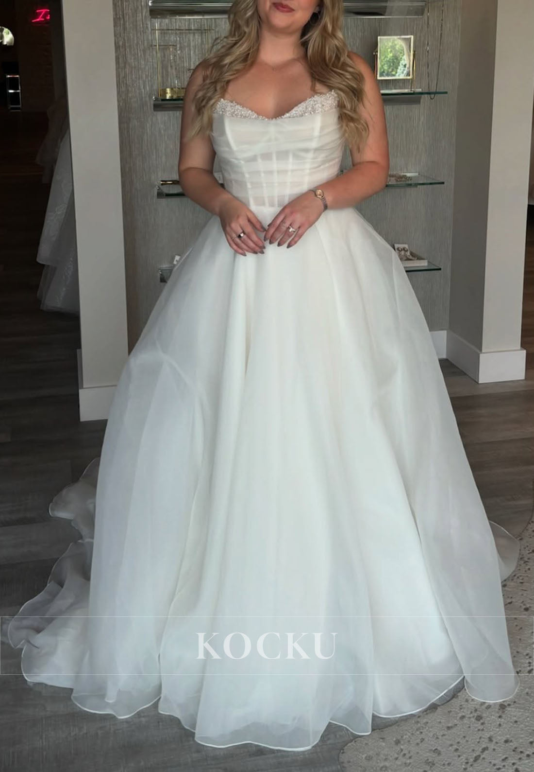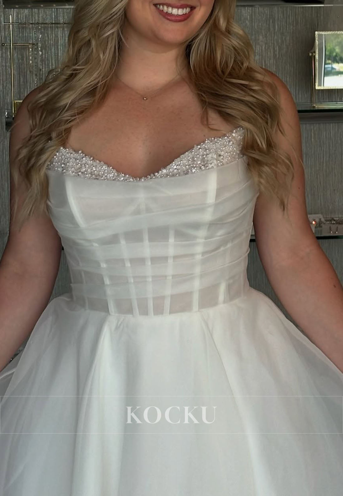 Embrace timeless elegance in this expertly crafted A-line wedding dress featuring a flattering V neckline and sleeveless design. Delicate beading adorns the bodice, creating luminous sparkle and refined sophistication. The voluminous tulle skirt is expertly pleated, providing graceful movement and dimension while maintaining a polished silhouette. The lightweight fabric ensures comfort throughout your celebration, while the structured construction delivers both support and style. Meticulously designed for the modern bride seeking classic beauty with contemporary flair, this dress combines romantic details with practical wearability, making it an investment piece for your most cherished day.