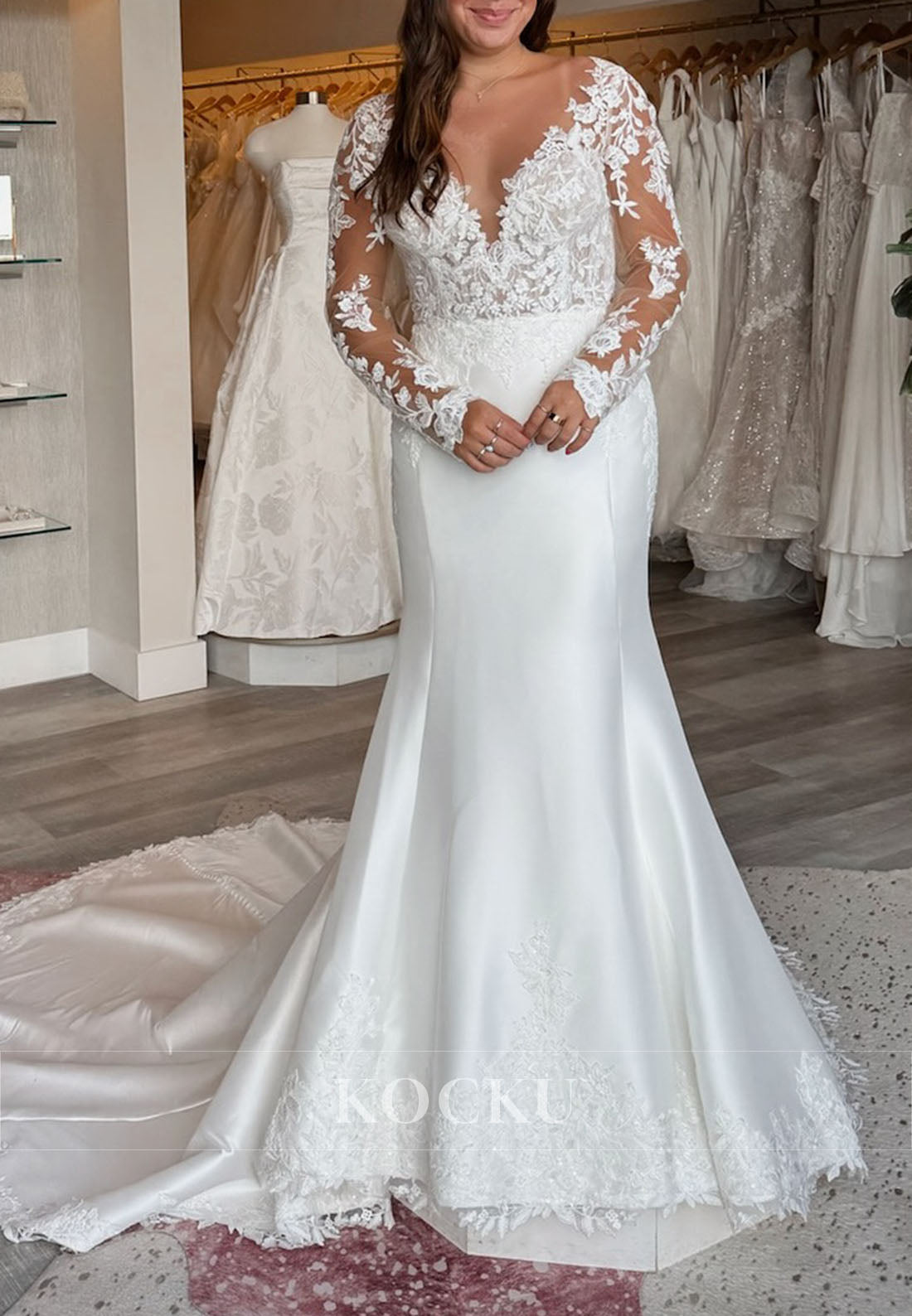 Mermaid Long Sleeves V Neck Embroidery Wedding Dress with Train