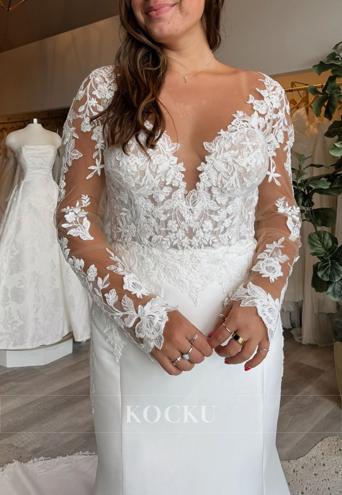 Command attention in this sophisticated mermaid wedding dress that celebrates curves with expert tailoring and refined elegance. The V neckline creates a flattering, elongated frame, while long sleeves add timeless romance and graceful coverage. Intricate embroidery details embellish the gown, showcasing artisanal craftsmanship and adding dimension throughout. The fitted silhouette hugs your form beautifully before flaring into a dramatic fishtail hem, creating a stunning focal point as you move. Expertly constructed for both comfort and confidence, this dress delivers a show-stopping aesthetic that balances sensuality with sophistication—perfect for the bride seeking a bold, memorable statement.
