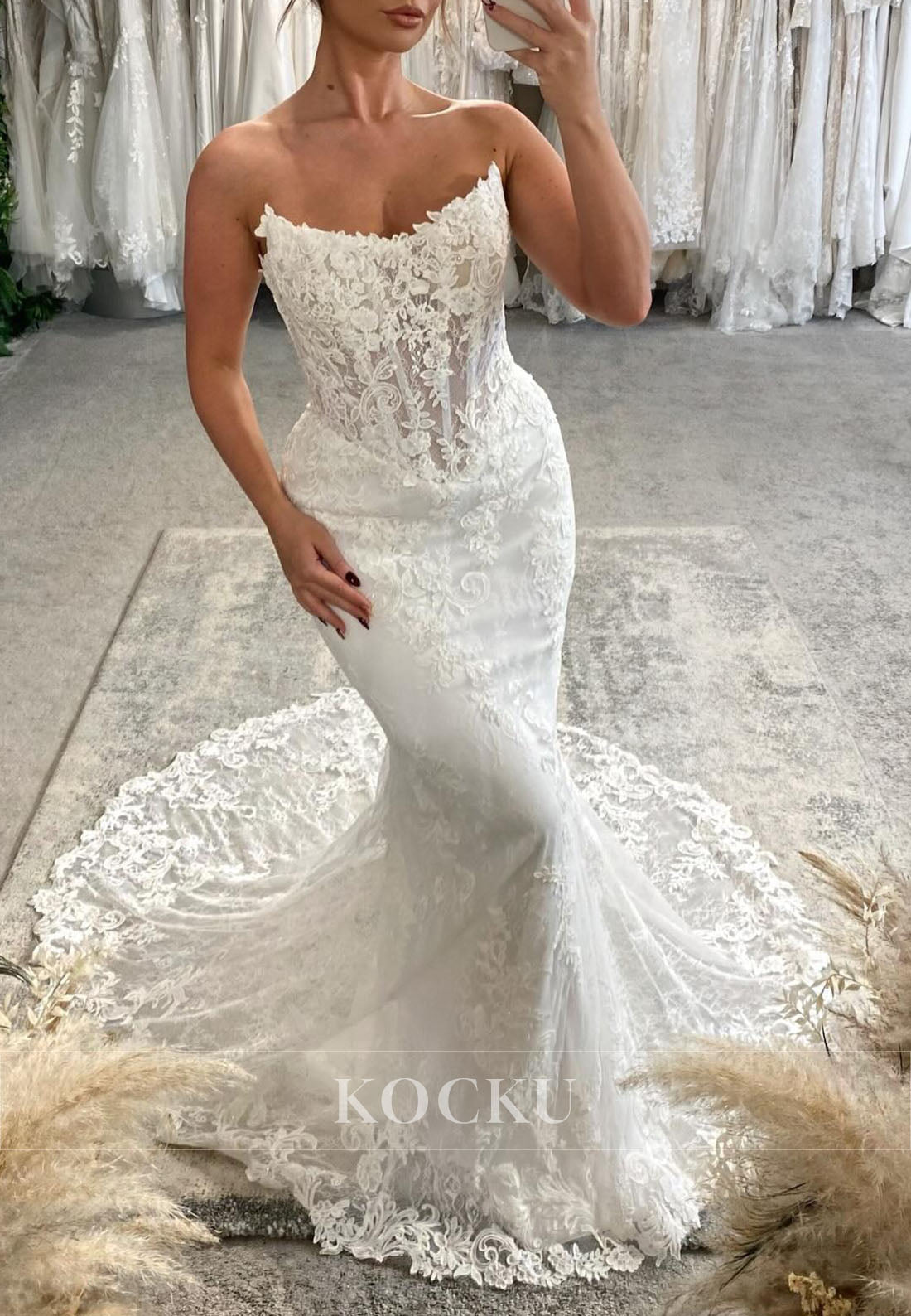 Captivate in this mermaid wedding dress featuring a classic scoop neckline and strapless design that creates an uninterrupted, elegant canvas across the shoulders and chest. Intricate lace detailing adorns the entire gown, delivering romantic sophistication and timeless bridal appeal. The sleek mermaid silhouette hugs the body gracefully before flaring dramatically at the knee, creating a stunning hourglass effect that commands attention. The detachable train offers exceptional versatility—wear it for the ceremony's formal grandeur, then remove it for comfortable dancing and movement at the reception. Perfect for brides seeking a refined, adaptable design that transitions seamlessly throughout the wedding day.