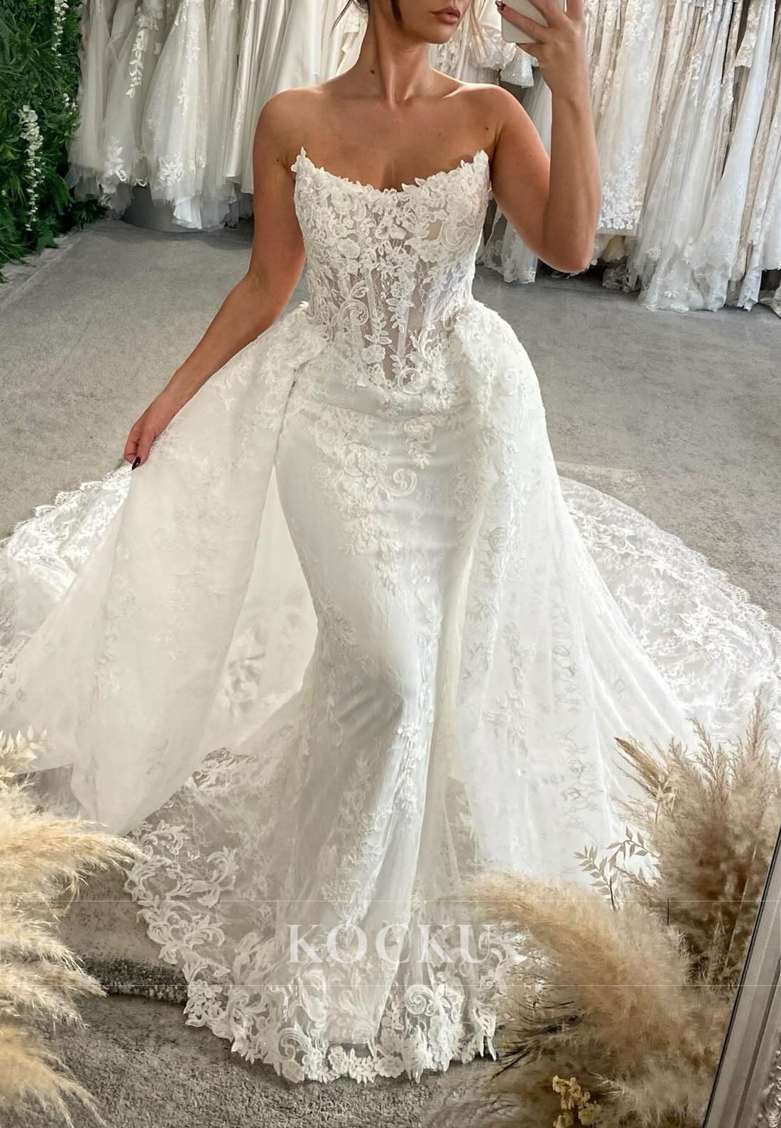 Mermaid Scoop Neck Strapless Sleeveless Lace Wedding Dress with Detachable Train - Ivory is backordered and will ship as soon as it is back in stock.