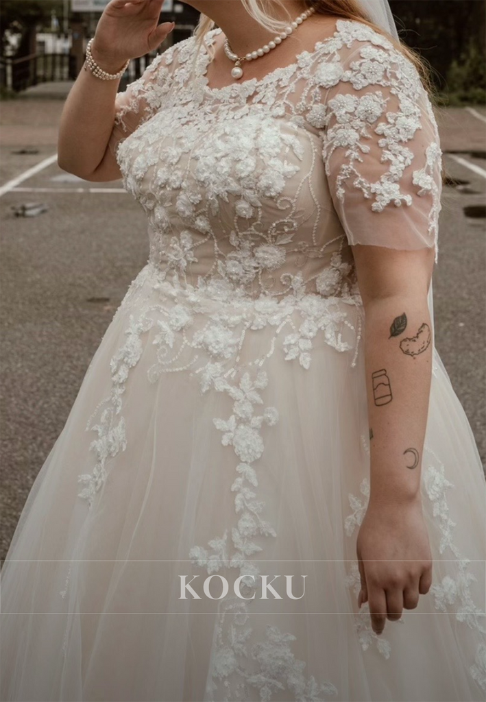 Short Sleeve Illusion Neck Appliques Pleated Wedding Dresses with Court Train