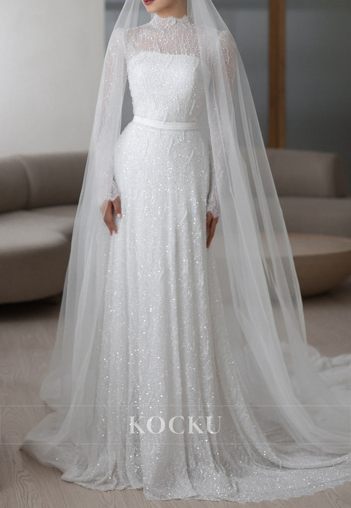 High Neck - Long Sleeve Sequins Beaded Sheath Wedding Dresses