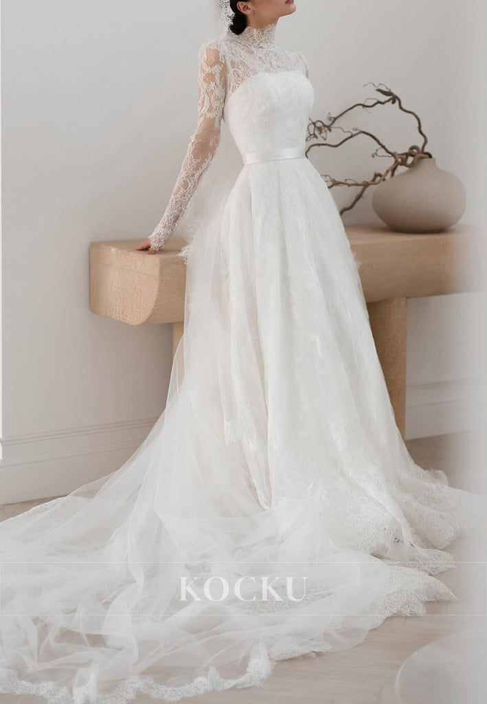 Long Sleeve Illusion Neck Appliques Lace Wedding Dresses with Court Train