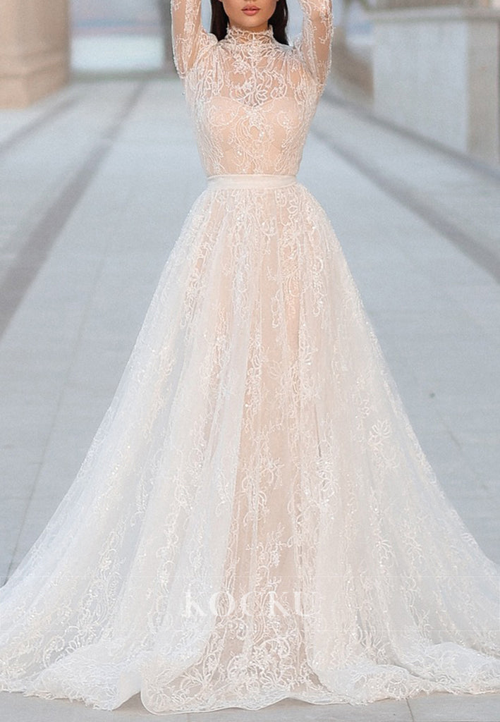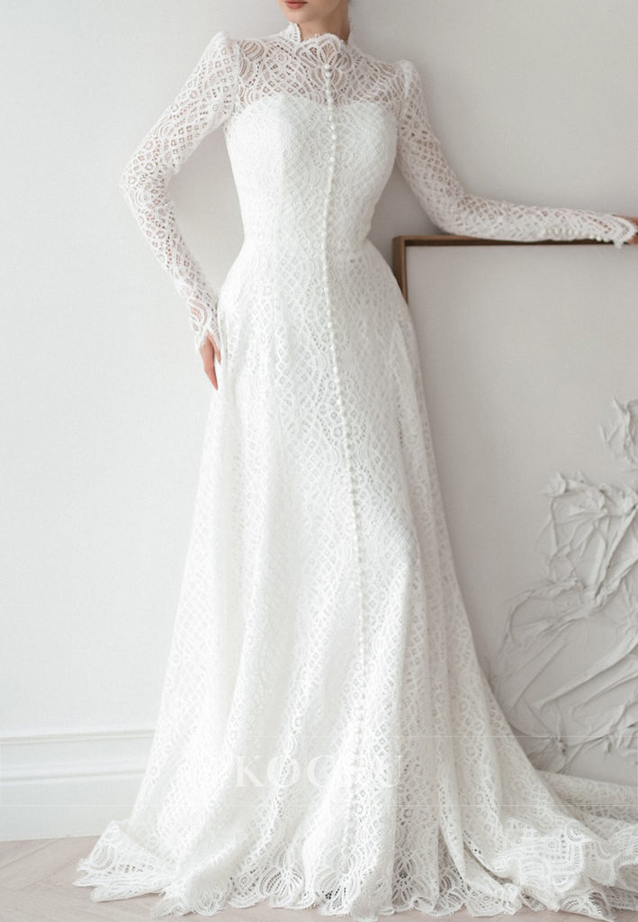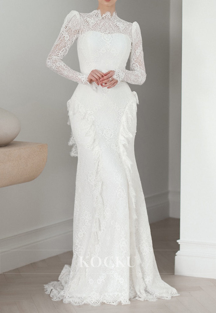 High Neck Beaded Appliques Lace Long Sleeve Sheath Wedding Dresses