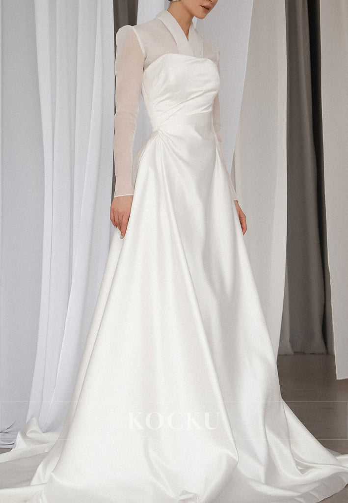 Illusion Neck - Long Sleeve Pleated Sheath Wedding Dresses with Sweep Train