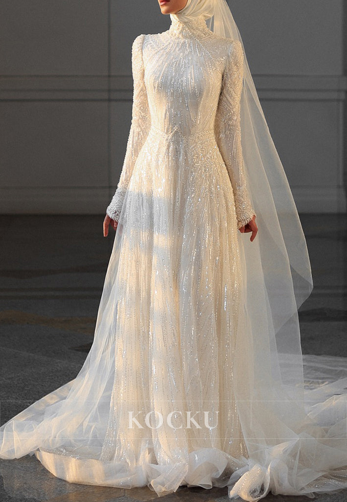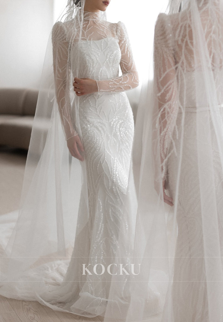 High Neck - Long Sleeve Beaded Mermaid Wedding Dresses with Detachable Train