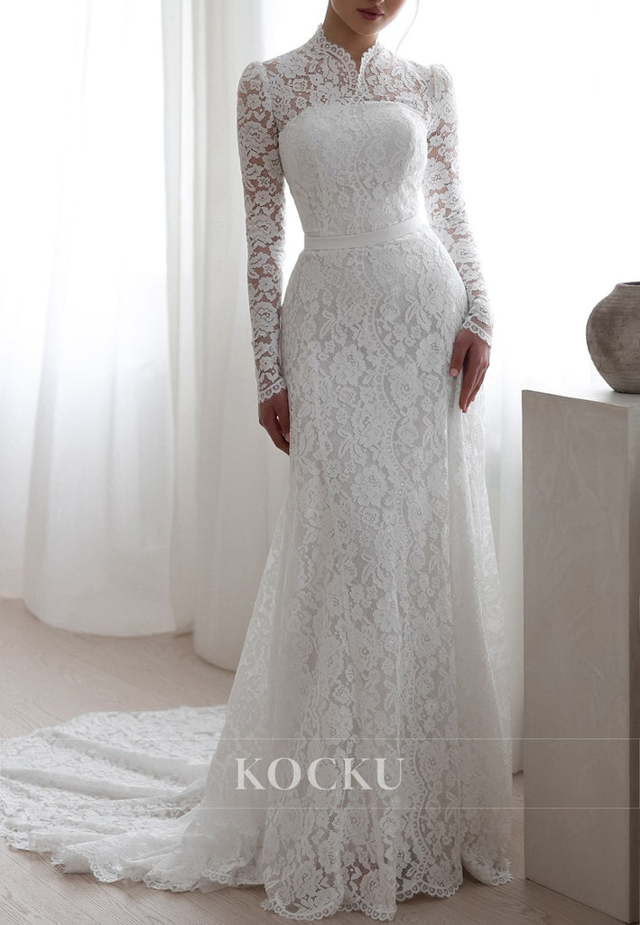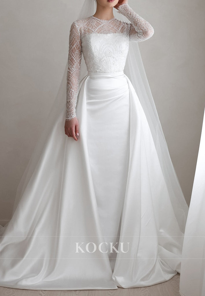 Elegant High - Neck Lace & Satin Wedding Dress with Long Sleeves & Detachable Train