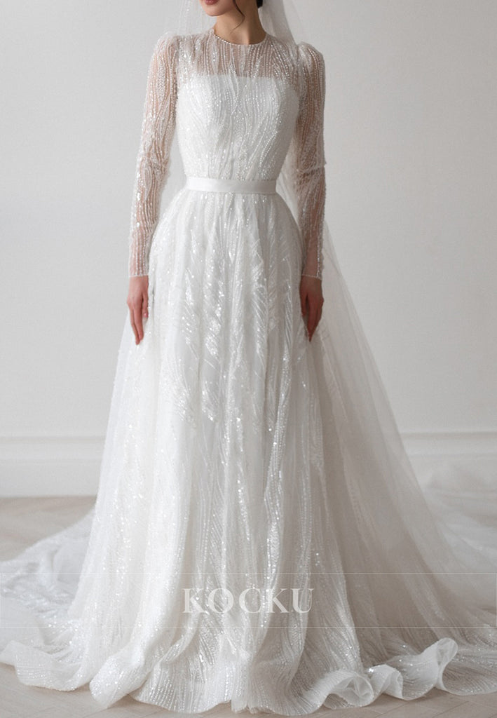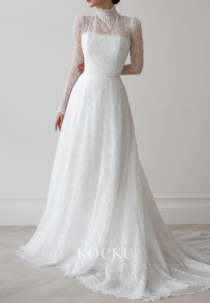 High - Neck Lace Wedding Dress with Sheer Long Sleeves and Sparkle Detailing
