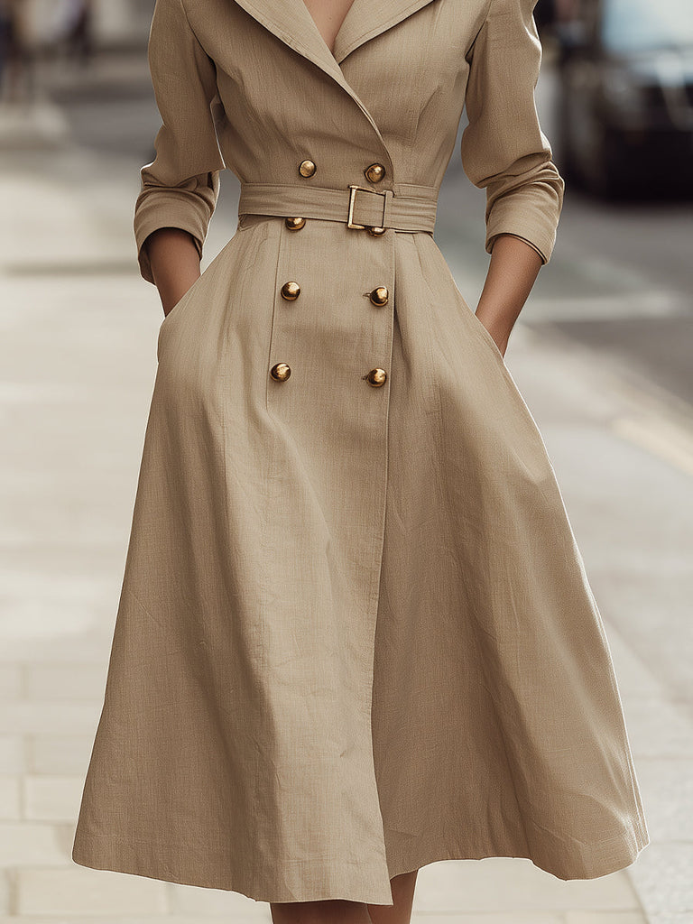 Beige Double-Breasted Belted Trench Coat Dress With Gold Buttons